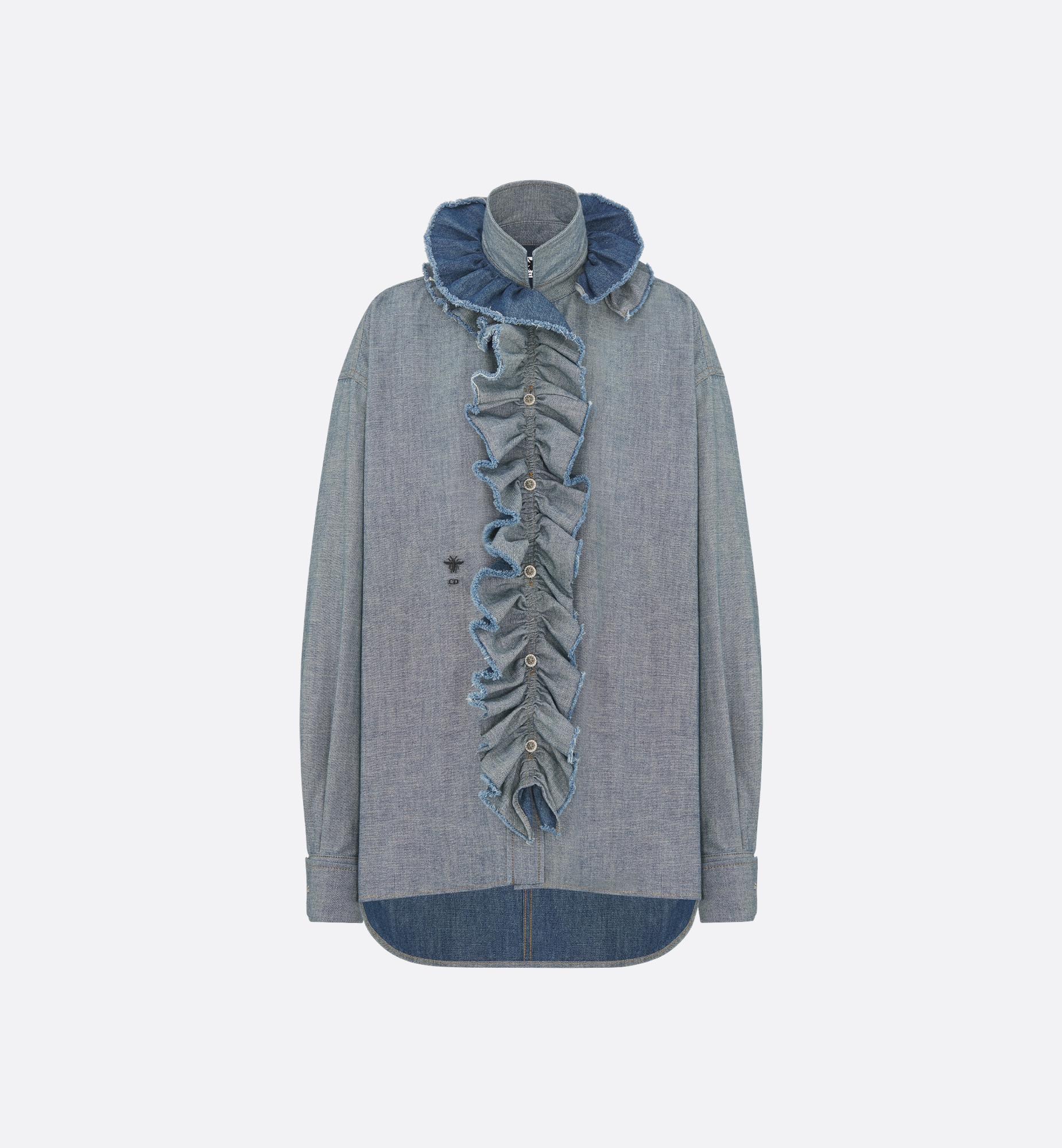 A must-have Dior silhouette, the blouse celebrates the collection's opulent aesthetic. Made in blue cotton denim, it features a regular fit enhanced by the collection's hallmark removable ruched collar, as well as a closure showcasing mother-of-pearl buttons adorned with a finely carved star in silver-finish metal. The blouse can be styled with a skirt or pants from the collection to create a couture look. - Embroidered hallmark bee and CD signature - Removable ruched collar - Front button closure - Buttoned cuffs - Mother-of-pearl buttons with silver-finish metal star - Unlined - 100% cotton - Made in Italy Size & Fit - Regular fit - Long sleeves - Using our personalized tool will provide you with the best size recommendation - For more information, please review the size guide