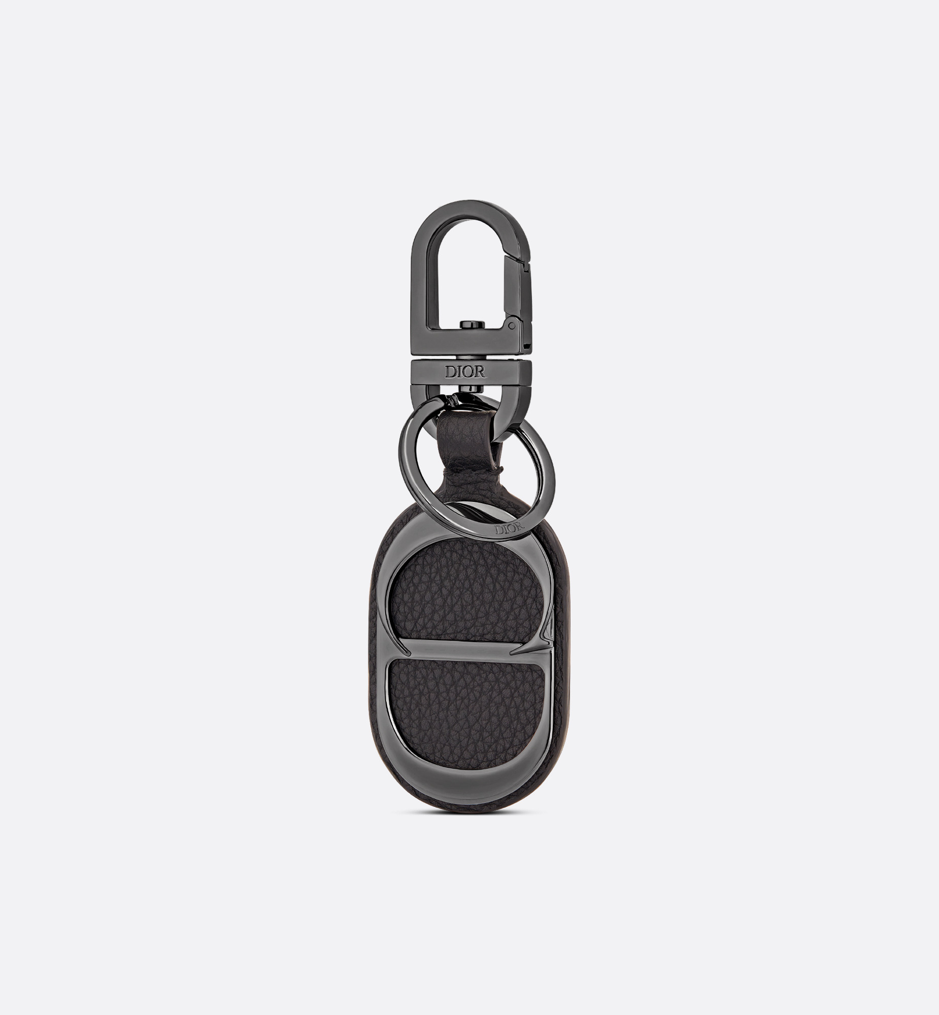 The key ring honors the iconic CD Icon signature. It is crafted in black grained calfskin with ruthenium-finish brass. The Dior-engraved ring and lobster clasp allow it to be easily attached to a belt loop or a bag. - Main composition: brass and calfskin - Dior-engraved ring and lobster clasp - Ruthenium-finish brass CD Icon signature - Dust bag included - Made in Italy or Spain Size & Fit - One size