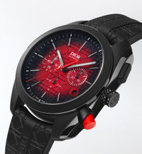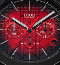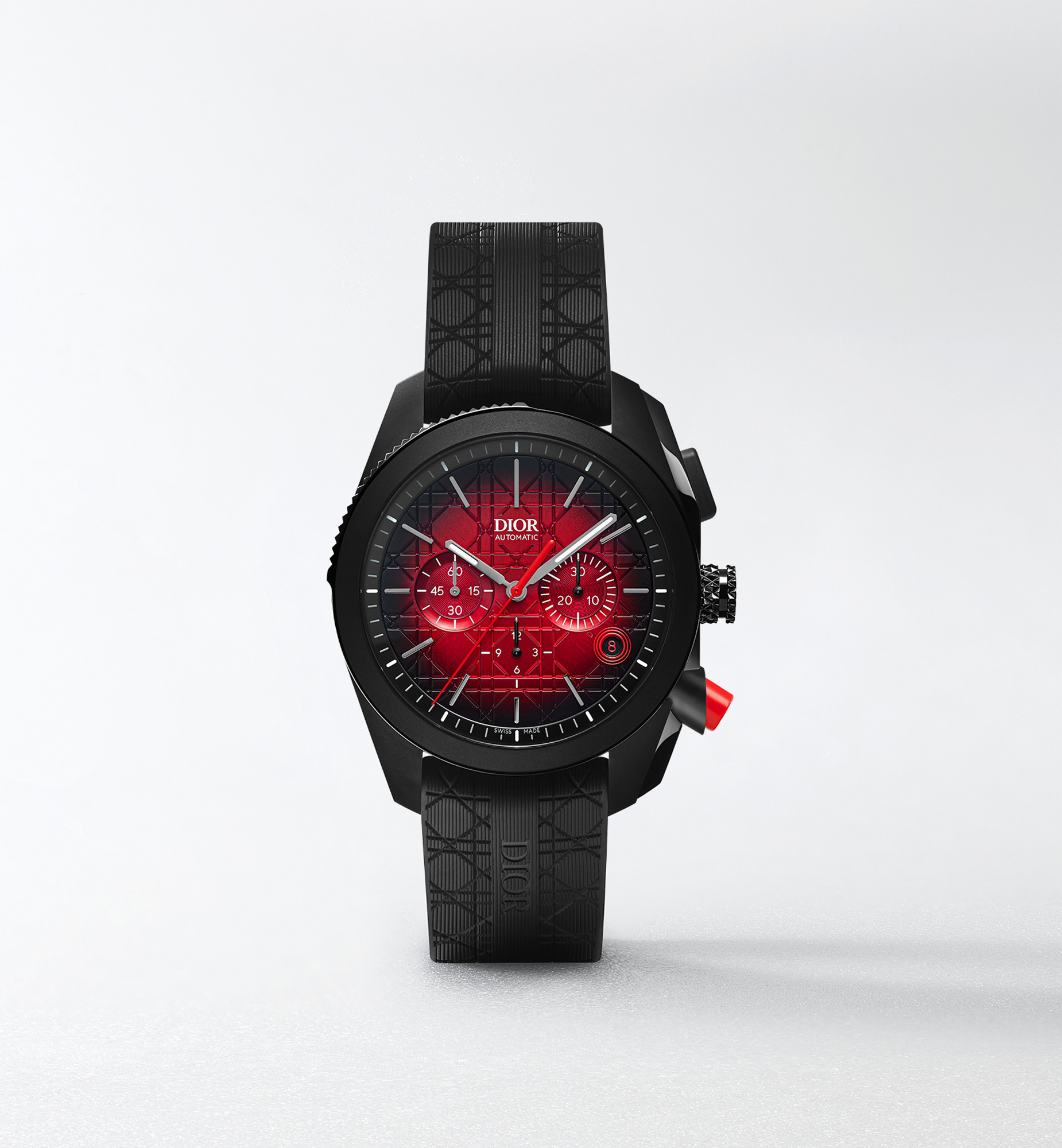 Since its launch in 2004, Chiffre Rouge has stood out as a bold and unique timepiece thanks to the architectural asymmetry of its bipartite round case, reinforced by the position of its crown at 4 o'clock. Twenty years after its inception, the iconic collection straddles tradition and transformation through new pieces that embody emblematic House codes, seen in details chosen for their elegance and couture aesthetic. In particular, some of the never-before-seen designs feature a vibrant shade of red — 'the color of life,' to quote Mr. Dior — in a stunning gradient on a metal-finish dial. The collection is an ode to the House's creative excellence. - Case: 41 mm (1.5) black DLC-coated steel - Black DLC-coated steel bezel, notched between 9 o'clock and 12 o'clock - Black chronograph push button at 2 o'clock, start/stop function - Red chronograph push button at 4 o'clock for resetting to zero - CD-engraved black screw-down crown - Water resistant: 100 meters (328 feet) - Gradient red brass dial with embossed Cannage motif - Luminescent hour and minute hands and brass indices - Red chronograph second hand - Anti-glare sapphire crystal - Black rubber strap with Microcannage motif, standard size - Ultramatte black steel folding clasp with easy-fastening system - The design is compatible with Chiffre Rouge interchangeable straps for O 41 mm - If the standard size Chiffre Rouge strap is not the right fit, we recommend visiting a boutique for a more suitable size - CD.001 automatic movement (Zenith El Primero, designed and embellished for Dior) - Approximately 48-hour power reserve - Functions: Hours - Minutes - Seconds - Date - Chronograph: second, 30-minute and hour counters - Oscillations: 36,000/hour - Frequency: 5 hertz - Five-year warranty - Made in Switzerland