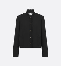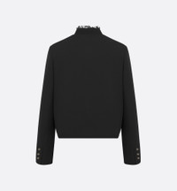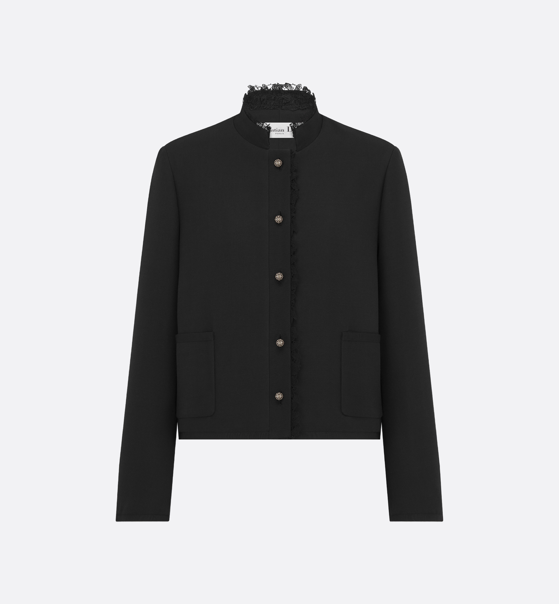The cropped jacket revisits House elegance. Crafted in black wool and silk, it has a cropped, regular-fit silhouette with an officer collar and delicate lace detailing accentuating its refined aesthetic. It is adorned with Dior Tribales buttons, finely carved in silver-finish metal with the CD signature and inspired by the iconic House earring. Embellished with patch pockets, the jacket will elevate any of the season's looks. - Front Dior Tribales button closure - Tonal lace detailing - Tonal lining - 77% wool, 23% silk and lining: 100% silk - Made in Italy - We recommend removing the accessories before cleaning Size & Fit - Cropped regular fit - Long sleeves - Using our personalized tool will provide you with the best size recommendation - For more information, please review the size guide