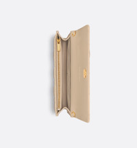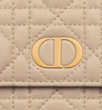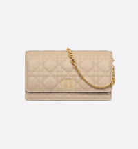 The Dior Caro pouch is a practical and elegant creation. Crafted in powder beige supple calfskin with Cannage stitching, it features an antique gold-finish metal CD signature flap that reveals a compartment to hold all the essentials. The removable CD-link chain allows it to be carried by hand, worn over the shoulder or crossbody, thus making it an ideal daily companion. - CD signature on the front - Flap closure - One zip pocket - Six card slots - One spacious interior compartment with a slip pocket - One rear curved slip pocket - Removable chain strap - Made in Italy Size & Fit - Dimensions: 20 x 11.5 x 3.5 cm / 8 x 4.5 x 1.5 inches (Length x Height x Width) - The size is suitable for a phone and a card holder - Chain length: 110 cm / 43.5 inches - Chain drop length: 52 cm / 20.5 inches - Weight: 330 g / 11.5 ounces