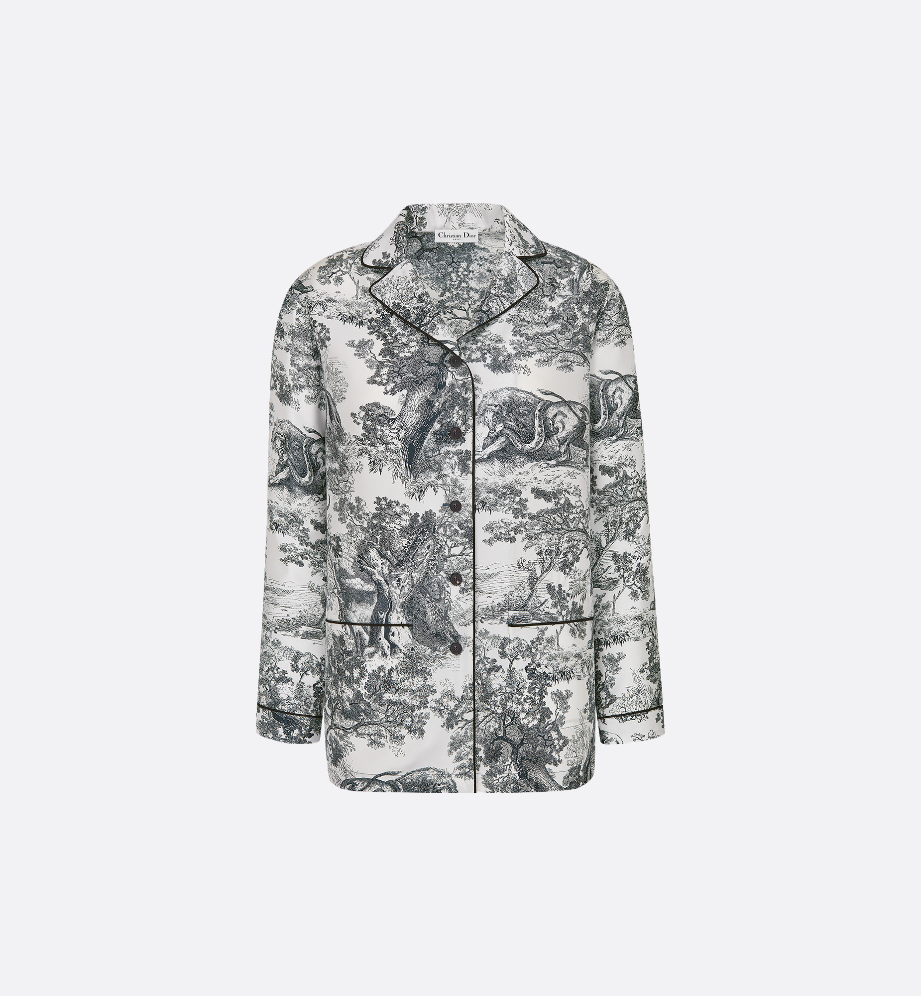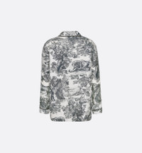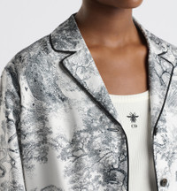 The Dior Chez Moi shirt features the emblematic and classic Toile de Jouy motif. Crafted in white and navy blue silk twill, the design is embellished with black piping and a notched collar for an elegant contrast. A button closure and two pockets adorn the front. The lightweight and refined shirt can be worn with the Dior Chez Moi pants for a total look. - Black piping details - Front button closure - Christian Dior Paris signature horn buttons - Unlined - 100% silk - Made in Italy Size & Fit - Loose fit - Long sleeves - Using our personalized tool will provide you with the best size recommendation - For more information, please review the size guide