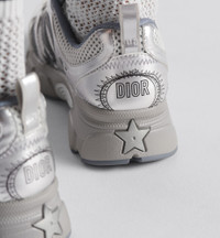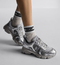 New for Fall 2024, the Dior Chrono sneaker revisits the running shoe with the House's couture codes. Pairing gray mesh with silver-tone laminated leather-effect panels, it is accented by hallmark details like the CD signature on the sides, a star patch on the tongue and a rear Dior signature. Featuring three-tone laces and an ultra-lightweight sole adorned with a star, the sneaker will complete laid-back outfits year-round. - CD signature on the sides - Star patch on the tongue - Dior signature on the back - Three-tone laces - Signature EVA sole with star, Christian Dior's lucky symbol - Made in Italy - Additional set of laces provided Size & Fit - The style fits true to size, we recommend ordering your normal shoe size - For those with wider feet, we recommend ordering a half-size larger than your normal size - Weight: 380 g / 13.5 ounces - Using our personalized tool will provide you with the best size recommendation - For more information, please review the size guide