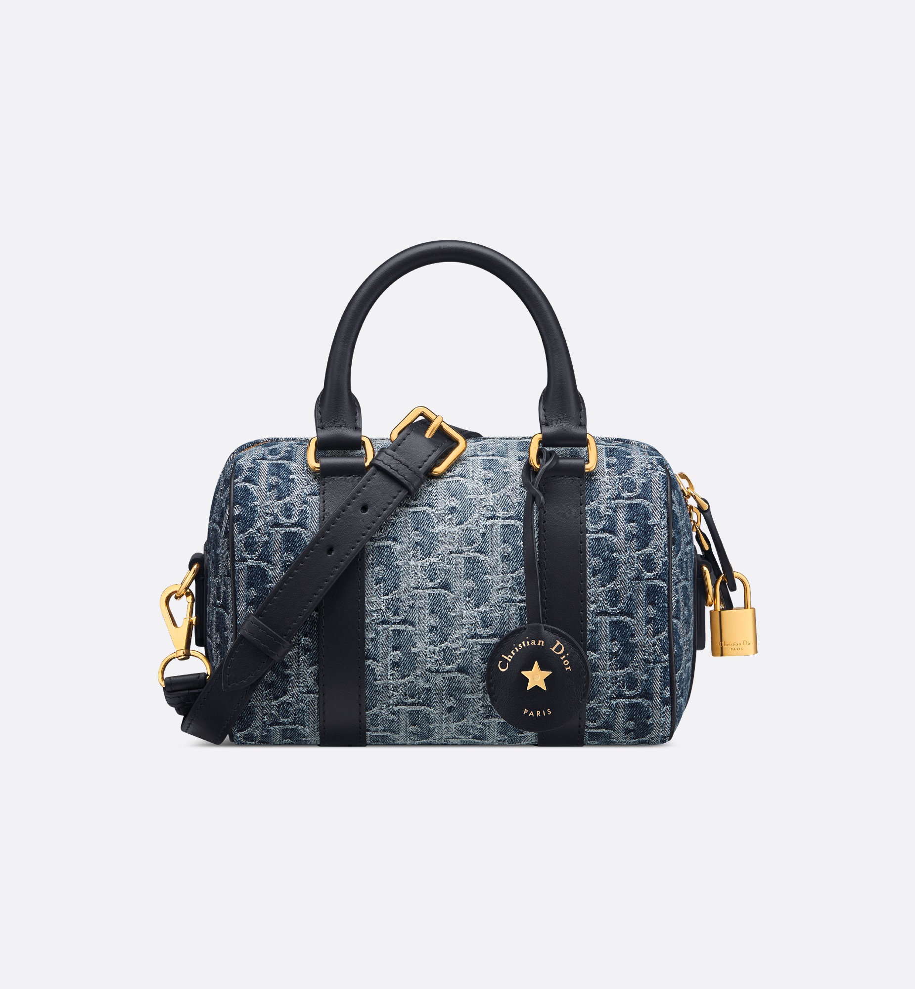 The Dior Groove 20 bag is an elegant and modern style designed by Maria Grazia Chiuri. Constructed in blue Denim Dior Oblique jacquard, offering a new take on the iconic House motif with the modern appeal of an irregular stonewashed effect, it stands out with a leather key holder engraved with the Christian Dior Paris signature and a gold-finish star. The attached key opens the zipper padlock to reveal a spacious compartment that can accommodate all the essentials, completed by a slip pocket and a zip pocket. Featuring leather top handles and an adjustable, removable strap, the bag can be carried by hand, worn over the shoulder or crossbody as an ideal daily companion. - Main composition: cotton and calfskin - Cotton and calfskin lining - Zip closure with padlock engraved with Christian Dior Paris - Christian Dior Paris signature leather key holder with antique gold-finish metal star and key - Adjustable and removable leather shoulder strap - Interior zip pocket - Interior slip pocket - Dust bag included - Made in Italy Size & Fit - Dimensions: 20.5 x 13.5 x 12 cm / 8 x 5.5 x 4.5 inches (Length x Height x Width) - The size is suitable for a phone, a wallet, a card holder, sunglasses and lipstick - Strap length: 115 – 130 cm / 45.5 – 51 inches - Drop length: 49.5 – 57.5 cm / 19.5 – 22.5 inches - Weight: 645 g / 23 ounces