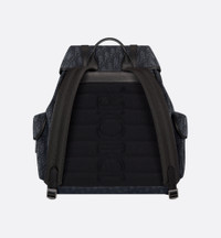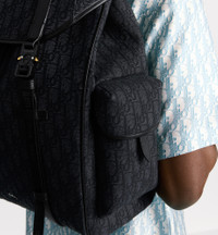 The Dior Hit the Road backpack with flap offers a modern take on the House's couture spirit. Crafted in black Dior Oblique jacquard, it is accented by tonal grained calfskin detailing and the Dior signature on the front. Featuring a flap with aluminum CD mini buckles and two Christian Dior nylon jacquard straps, it has a spacious main compartment as well as two magnetic flap pockets on the sides. The practical backpack will lend the finishing touch to casual attire. - Main composition: cotton, technical fabric and calfskin - Technical fabric, cotton and calfskin lining - Main compartment with flap and drawstring cord - Tonal CD signature aluminum mini buckles and D-rings - Interior flat compartment for laptop - Magnetic side flap pockets - Leather top handle - Adjustable padded shoulder straps - Padded mesh back with Dior signature - Ruthenium-finish brass Dior signature on the front - Embossed Dior signature on the interior - Dust bag included - Made in Italy Size & Fit - Dimensions: 43 x 43 x 18 cm / 17 x 17 x 7 inches (Length x Height x Width) - The main compartment's size is suitable for a 15-inch laptop computer, A4 documents and a tablet - The size of the side pockets is suitable for all phone models - Size and weight details may vary depending on the product's material