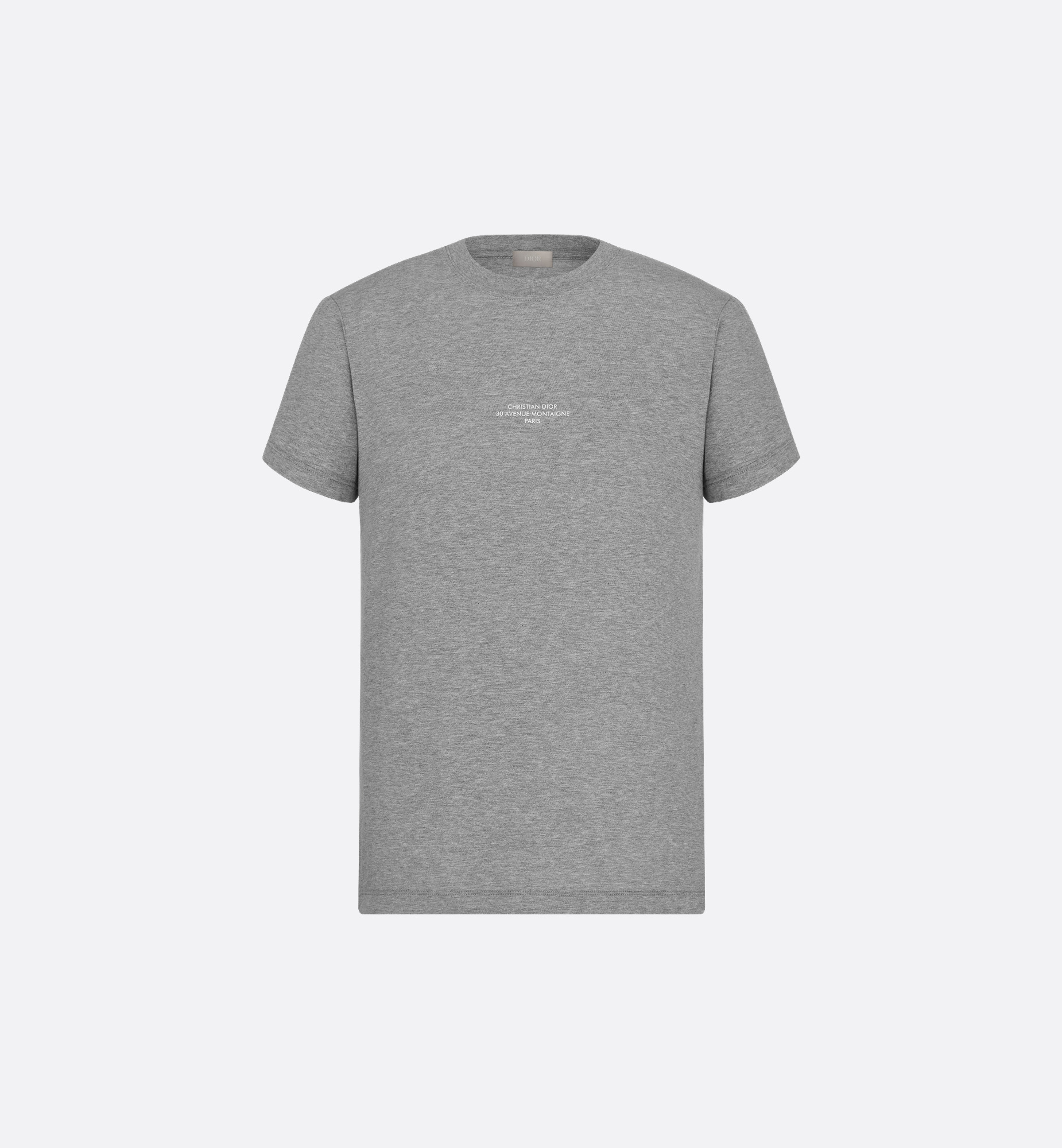 The Dior Montaigne T-shirt showcases the House's iconic address. Crafted in gray cotton jersey, it is embellished with a contrasting Dior Montaigne print on the chest. Featuring a modern silhouette, the lightweight T-shirt will pair well with jeans or track pants. - Dior Montaigne print - Finely ribbed crew neck - 100% cotton - Made in Italy Size & Fit - Regular fit - The style fits true to size, we recommend ordering your regular size - Garment length: 68 cm / 27 inches (size M) - The model measures 189 cm / 74.5 inches and the item shown is in size M (FR) - Using our personalized tool will provide you with the best size recommendation - For more information, please review the size guide