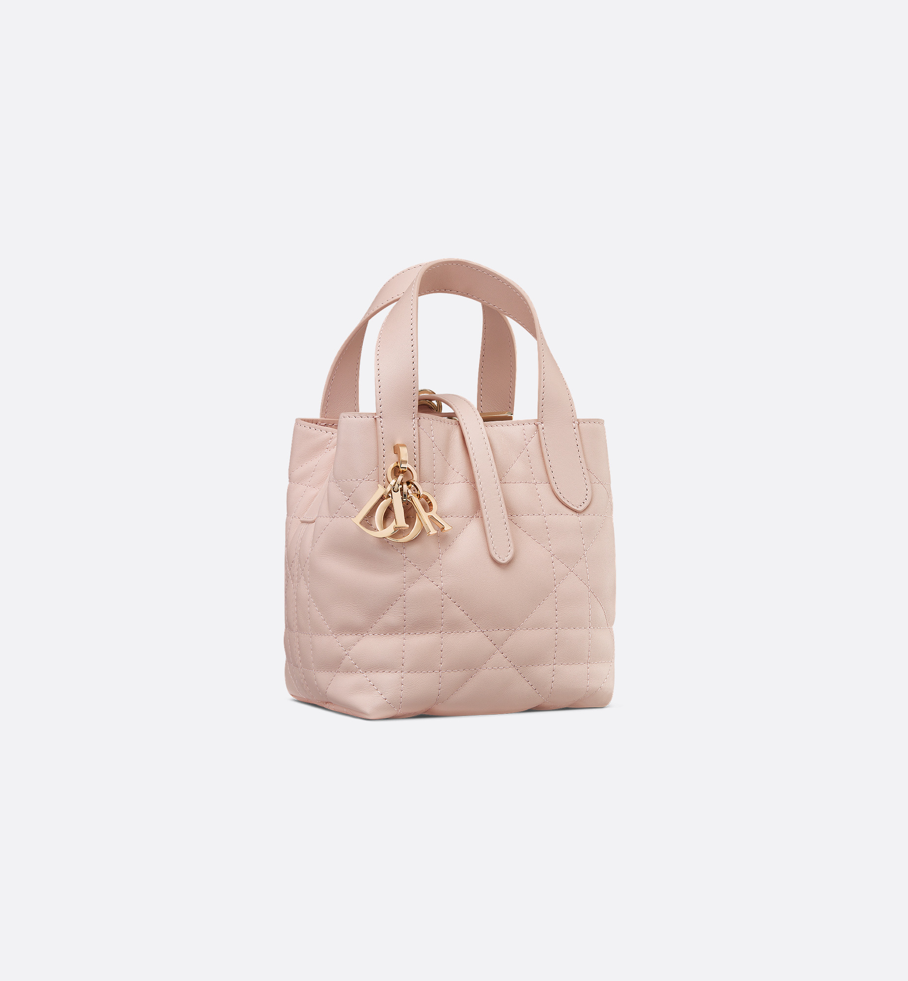New for Fall 2025, the modern and practical Dior Toujours vertical tote bag is presented in a nano variation. Crafted in powder pink calfskin with Macrocannage topstitching, it has a spacious interior compartment to accommodate all the essentials. Its thin leather strap closure keeps items secure, while the D of the pale gold-finish metal CD Lock clasp twists to adjust the sides and enhance the bag's silhouette. The leather top handles are completed by a removable leather strap, allowing the bag to be carried by hand, worn over the shoulder or crossbody. - Main composition: calfskin - Calfskin lining - Double closure: a thin lace-through strap and a Christian Dior Paris strap with a CD Lock clasp - D.I.O.R. charms - Interior slip pocket - Leather top handles - Removable leather shoulder strap - Dust bag included - Made in Italy Size & Fit - Dimensions: 13 x 15 x 12 cm / 5 x 6 x 4.5 inches (Length x Height x Width) - The size is suitable for a phone, a card holder and lipstick - Strap length: 113 cm / 44.5 inches - Drop length: 52 cm / 20.5 inches - Top handle length: 22 cm / 8.5 inches - Top handle drop length: 8 cm / 3 inches - Weight: 330 g / 11.5 ounces - Size and weight details may vary depending on the product's material