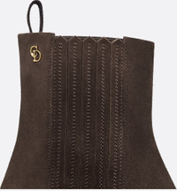 New for Winter 2025, the Dior Wild heeled ankle boot is a couture design. The chocolate brown suede calfskin silhouette is elevated by suede calfskin-covered elastic panels on the sides and a gold-finish metal CD signature from the House archives on the back. A 6-cm (2.5-inch) Cuban heel completes the distinctive shoe. - Main composition: suede calfskin and technical fabric - Calfskin and technical fabric lining - Gold-finish metal CD signature on the back - Rear tab - Calfskin and rubber sole with star, Christian Dior's lucky symbol - Made in Italy Size & Fit - Cuban heel: 6 cm / 2.5 inches - Using our personalized tool will provide you with the best size recommendation - For more information, please review the size guide