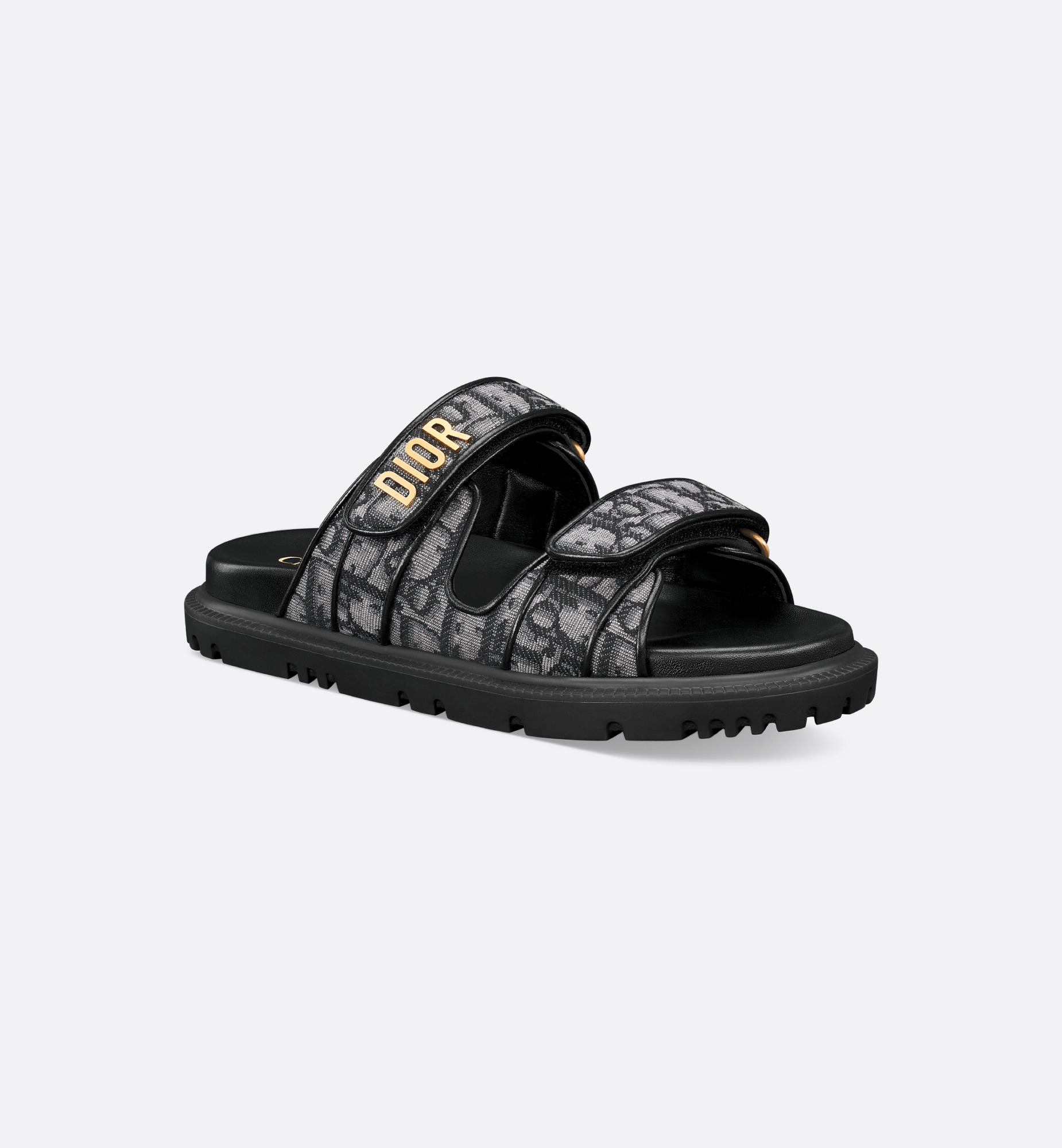 The Dioract slide has a modern silhouette in deep gray Dior Oblique embroidered cotton. The style features an ultralightweight and comfortable anatomically shaped insole as well as self-fastening straps further enhanced by a gold-finish metal Dior signature on the upper strap. The slide will lend a contemporary touch to any look. - Main composition: cotton and technical fabric - Lambskin lining - Gold-finish metal Dior signature - Two adjustable self-fastening straps - Anatomically shaped leather insole - Notched EVA sole with star, Christian Dior's lucky symbol - Made in Italy Size & Fit - Using our personalized tool will provide you with the best size recommendation - For more information, please review the size guide