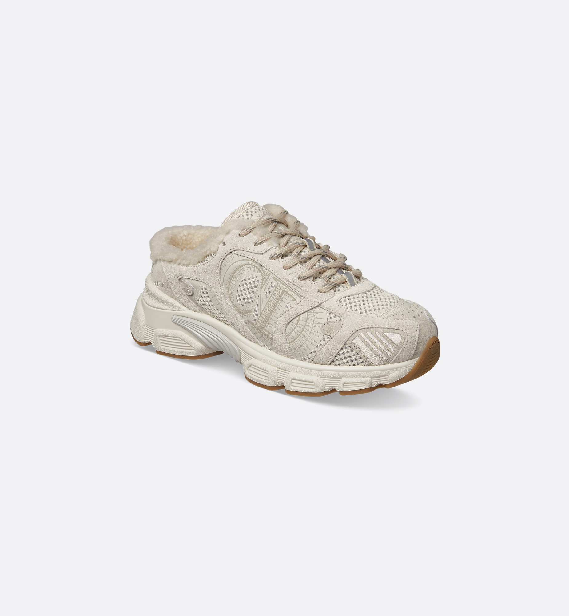 Part of the DiorAlps capsule, the Dior Chrono sneaker revisits the running shoe with the House's couture codes and an open heel. Pairing beige mesh with tonal suede calfskin panels and white lambskin shearling-effect lining, it is accented by hallmark details like the CD signature on the sides, a star patch on the tongue and a rear Dior signature. Featuring two-tone laces and an ultralightweight sole adorned with a star, the sneaker can be paired with other DiorAlps creations. - Main composition: technical fabric, calfskin and cotton - Technical fabric, virgin wool and cotton lining - CD signature on the sides - Star patch on the tongue - Dior signature on the back - Two-tone laces - Signature EVA sole with star, Christian Dior's lucky symbol - Made in Italy - Additional set of laces provided Size & Fit - Weight: 515 g / 18 ounces - Weight details may vary depending on the product's material - For more information, please review the size guide