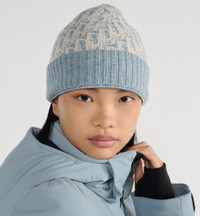 Part of the DiorAlps capsule, the beanie showcases the Dior Oblique motif, an iconic Dior symbol since its debut in 1969. The reversible style is crafted in ecru and chambray blue cashmere-blend intarsia jacquard on one side and solid chambray blue on the other. It is distinguished by a solid-colored wide cuff. The beanie can be coordinated with other DiorAlps creations to complete the look. - One side in ecru and chambray blue Dior Oblique intarsia jacquard, the other in solid chambray blue - Reversible style - Solid ribbed cuff - 94% cashmere, 5% polyamide, 1% elastane - Made in Italy Size & Fit - One size