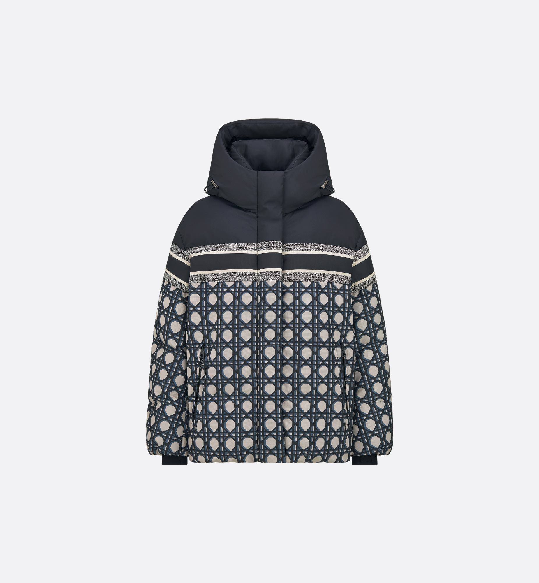 Part of the DiorAlps capsule, the hooded puffer jacket is a functional design with a couture touch. Crafted in blue and white padded technical taffeta with the Macrocannage motif, the waterproof style has a windproof membrane, interior cuffs and multiple pockets making it ideal for skiing. The technical puffer jacket can be worn with other creations from the DiorAlps capsule. - Embroidered hallmark bee and CD signature - Windproof membrane - Concealed front zip closure with snaps - Lining - Filling: 100% polyester - 100% polyester and lining: 100% polyester - Made in Italy Size & Fit - Relaxed fit - Long sleeves - Using our personalized tool will provide you with the best size recommendation - For more information, please review the size guide