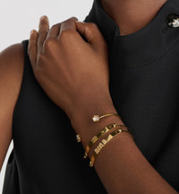 This season's Dio(r)evolution bracelet set is offered with a new finish. The three gold-finish metal bangle bracelets are enhanced by the 'DIOR' signature and amber-colored crystals. The modern and elegant bracelet set may be coordinated with other creations from the Dio(r)evolution line. - Amber-colored crystals - 'DIOR' signatures - Gold-finish metal - Hook clasp - Sold as a set of three - Made in Germany
