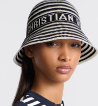 Part of the Dioriviera capsule, the D-Tulipe cloche is adorned with the timeless Dior Mariniere motif. Made in navy blue and white cotton-blend knit, it is enhanced by a tonal band embroidered with the Christian Dior Paris signature. Modern and elegant, the small brim hat will lend the finishing touch to laid-back looks and can be styled with other pieces from the Dioriviera capsule. - Tonal embroidered band with Christian Dior Paris signature - Small brim - Easy-to-carry, foldable design - 55% polyamide, 45% cotton - Made in Italy Size & Fit - The hat size corresponds to the head's circumference in cm / inches - Two sizes available: S (56 - 57 cm / 22 - 22.5 inches) and M (58 - 59 cm / 23 - 23.5 inches)