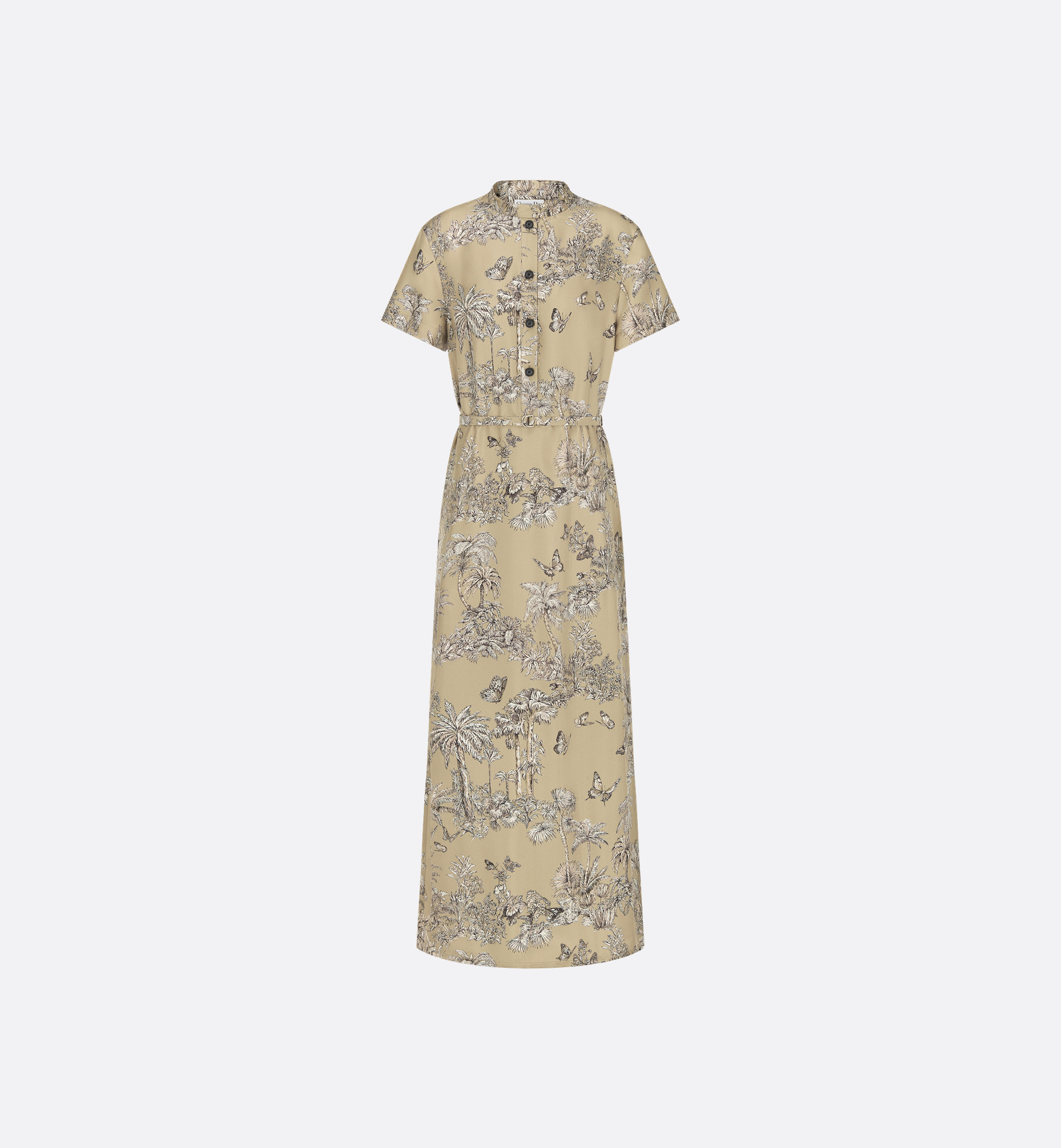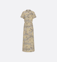 Part of the Dioriviera capsule, the long shirtdress showcases Pietro Ruffo's Toile de Jouy Palms motif, capturing the beauty of nature with a vibrant jungle scene populated by diverse wildlife. Crafted in hazelnut and white silk twill, it has a fluid silhouette enhanced by an officer collar, tonal belt highlighting the waist and side slit pockets. The short-sleeved shirtdress can be worn with other Dioriviera creations to complete the look. - Tonal belt - Front button closure - Christian Dior Paris horn buttons - Unlined - 100% silk - Made in Italy Size & Fit - Regular fit - Long silhouette - Short sleeves - Using our personalized tool will provide you with the best size recommendation - For more information, please review the size guide