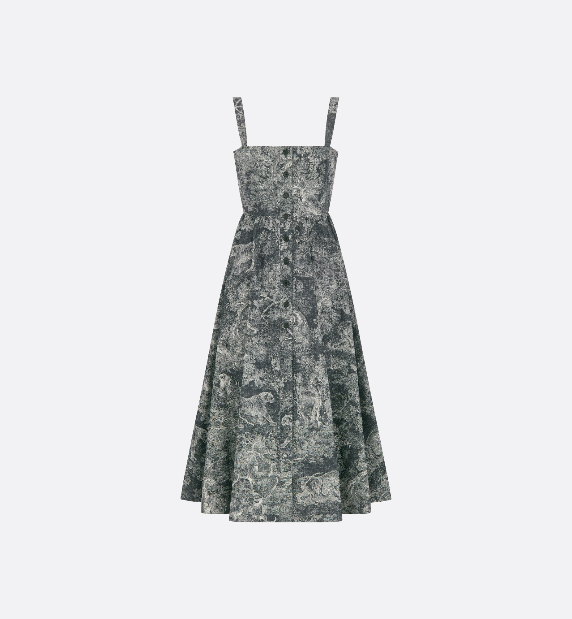Part of the Dioriviera capsule, the mid-length dress presents the Toile de Jouy Sauvage motif, a new take on the hallmark House pattern. Made in deep blue and white cotton and silk poplin, it has a flared silhouette, square neckline and gathered detailing at the waist. The sophisticated dress will pair with other Dioriviera creations to complete the look. - Front horn buttons - Unlined - 75% cotton, 25% silk - Made in Italy Size & Fit - Flared cut - Mid-length - Sleeveless - Using our personalized tool will provide you with the best size recommendation - For more information, please review the size guide