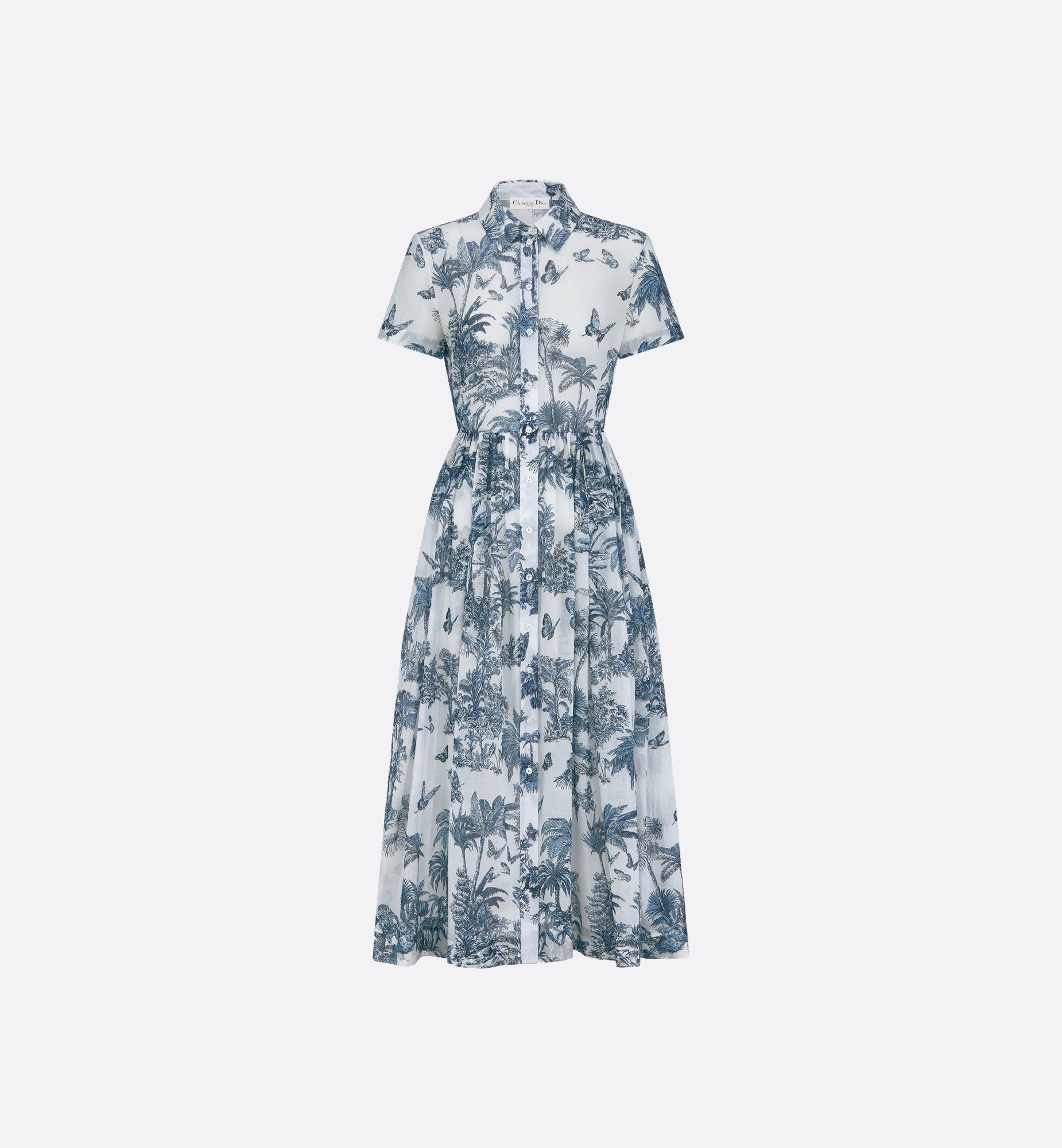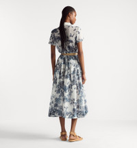 Part of the Dioriviera capsule, the mid-length shirtdress showcases Pietro Ruffo's Toile de Jouy Palms motif, capturing the beauty of nature with a vibrant jungle scene populated with diverse wildlife. Crafted in white and blue cotton muslin, it features a very elegant flared silhouette, short sleeves and a button closure on the front. The dress can be coordinated with other Toile de Jouy Palms creations to complete a Dioriviera look. - Front button closure - Christian Dior Paris mother-of-pearl buttons - Removable ecru lining - 100% cotton - Made in Italy Size & Fit - Flared cut - Mid-length - Short sleeves - The model measures 178 cm / 70 inches and the item shown is in size 36 (FR) - Using our personalized tool will provide you with the best size recommendation - For more information, please review the size guide