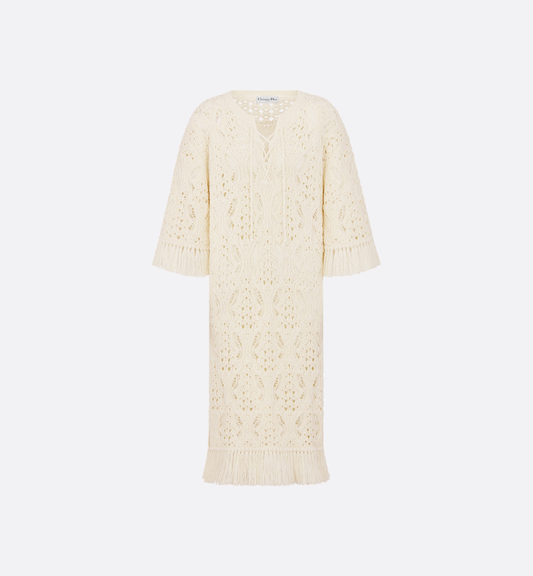 Part of the Dioriviera capsule, the mid-length dress showcases an elegant and refined look. Knit in ecru cotton with a crochet effect and butterfly motif, it features a straight cut with a lace-up neckline and fringed detailing embellishing the hem and three-quarter length sleeve edges. The dress can be styled with other capsule creations to complete a Dioriviera look. - Lace-up neckline - Fringed sleeve cuffs and hem - Unlined - 100% cotton (7 gauge)* - Made in Italy - Treat with extra care and gently dry clean Size & Fit - Regular fit - Mid-length - Three-quarter sleeves - Using our personalized tool will provide you with the best size recommendation - For more information, please review the size guide