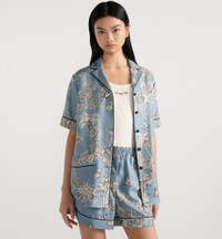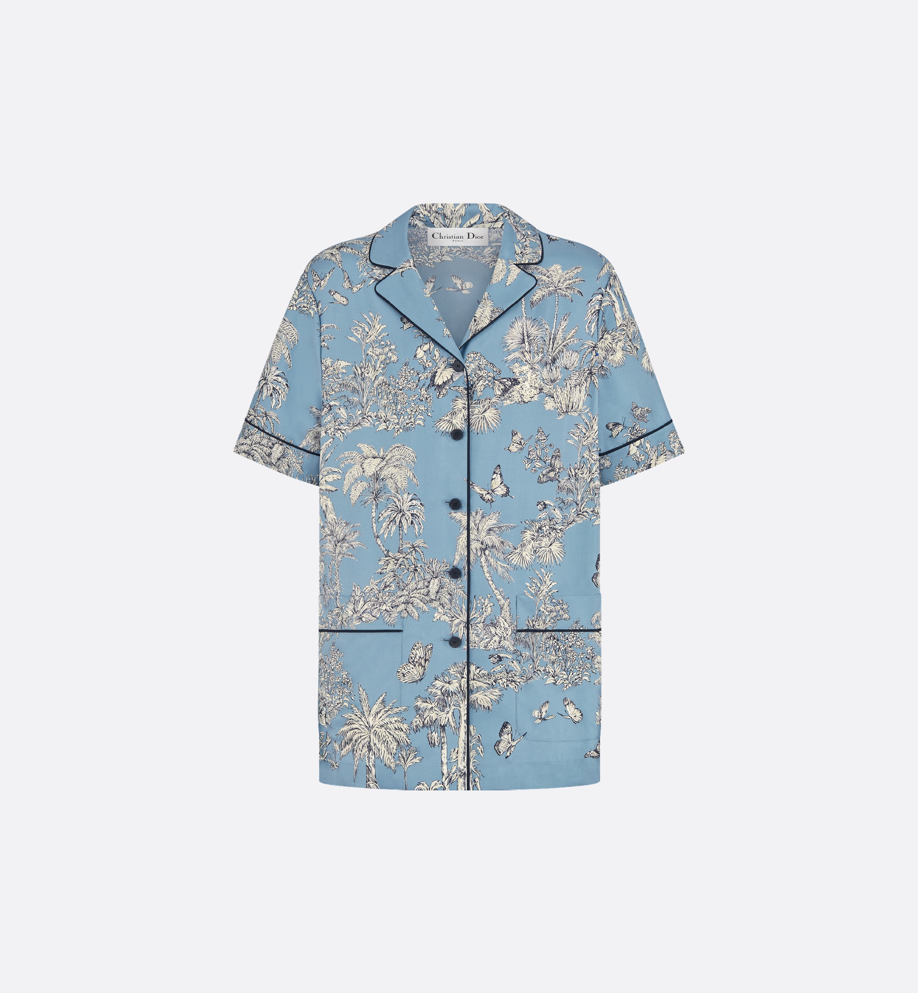 Part of the Dioriviera capsule, the shirt showcases Pietro Ruffo's Toile de Jouy Palms motif, capturing the beauty of nature with a vibrant jungle scene populated by diverse wildlife. Crafted in celestial blue and white silk twill, the design is embellished with black piping, creating an elegant contrast, while a button closure and two pockets adorn the front. The lightweight and refined short-sleeved shirt can be worn with other Toile de Jouy Palms creations to complete a Dioriviera look. - Black piping - Front button closure - Christian Dior Paris horn buttons - Unlined - 100% silk - Made in Italy Size & Fit - Relaxed fit - Short sleeves - We recommend ordering a size smaller than your regular size for a more comfortable fit - The model measures 178 cm / 70 inches and the item shown is in size 36 (FR) - Using our personalized tool will provide you with the best size recommendation - For more information, please review the size guide