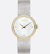 Featuring a Milanese mesh bracelet, the La D de Dior Satine watch translates the supple and luminous qualities of a fine silk ribbon into the language of watchmaking. - Case: 25 mm (1) stainless steel - 18K yellow gold bezel set with 50 brilliant-cut diamonds (0.50 ct*) - CD-engraved 18K yellow gold crown set with 13 brilliant-cut diamonds (0.03 ct*) - Water resistant: 30 meters (98 feet) - White mother-of-pearl dial set with 3 brilliant-cut diamond indices (0.02 ct*) - Polished dauphine hands - Anti-glare sapphire crystal - Milanese stainless steel bracelet - Steel folding clasp - Quartz movement - Functions: Hours – Minutes - Two-year warranty - Made in Switzerland - *The stone weights are based on average weights only.