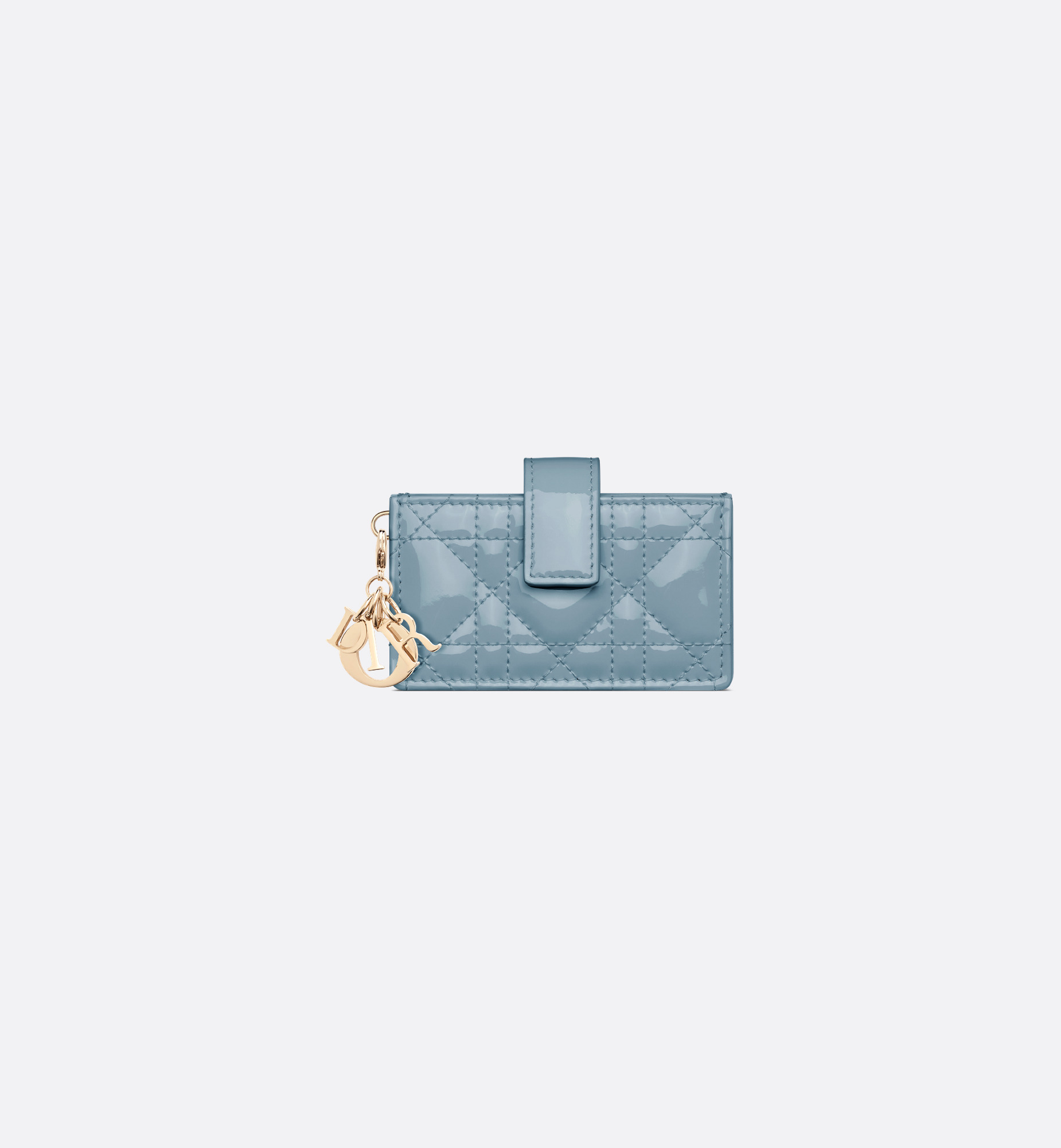 The Lady Dior Jasmine card holder pays tribute to the Dior leather artisans' savoir-faire with its timeless Cannage topstitching. Crafted in sky blue patent calfskin, the style is compact and functional and can accommodate the daily essentials. Embellished with detachable D.I.O.R. charms and a snap flap closure, the gusseted card holder can be coordinated with other Lady Dior creations. - Detachable D.I.O.R. charms - Front snap tab closure - Five gusseted compartments - Made in Italy/Spain Size & Fit - Dimensions: 10.5 x 6 x 3 cm / 4 x 2.5 x 1 inches (Length x Height x Width)