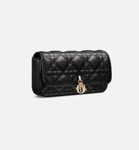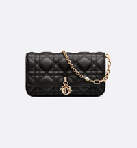 The My Dior - Dior Talk Phone Pouch is a clever and sophisticated creation. Crafted in black Cannage lambskin, it features pale gold-finish metal D.I.O.R. charms. Completed by an elegant removable chain punctuated with resin pearls, the phone pouch can be carried by hand, worn over the shoulder or crossbody. - Front D.I.O.R. charms - Removable chain strap - Two card slots - Made in Italy Size & Fit - Dimensions: 18.5 x 10 x 4 cm / 7.5 x 4 x 1.5 inches (Length x Height x Width) - The size is suitable for a phone and a card holder