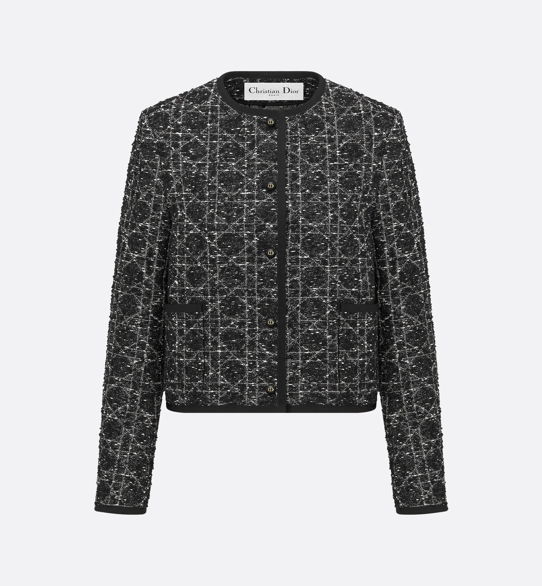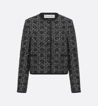 The jacket honors the signature Macrocannage motif. Crafted in black and white technical cotton tweed with a textured effect, it has a relaxed, cropped silhouette and front patch pockets. It is distinguished by grosgrain detailing and a button closure with black resin pearls decorated with the CD signature, inspired by the House's hallmark earring. The jacket will pair perfectly with a skirt from the season for a couture look. - Front closure with black CD resin pearl buttons - Grosgrain detailing - Lined sleeves - 54% cotton, 27% acrylic, 19% polyamide - Made in Italy - We recommend removing the accessories before cleaning Size & Fit - Cropped and relaxed fit - Back length: 50 cm / 19.5 inches (size 34) - Long sleeves - The model measures 177 cm / 69.5 inches and the item shown is in size 36 (FR) - Using our personalized tool will provide you with the best size recommendation - For more information, please review the size guide
