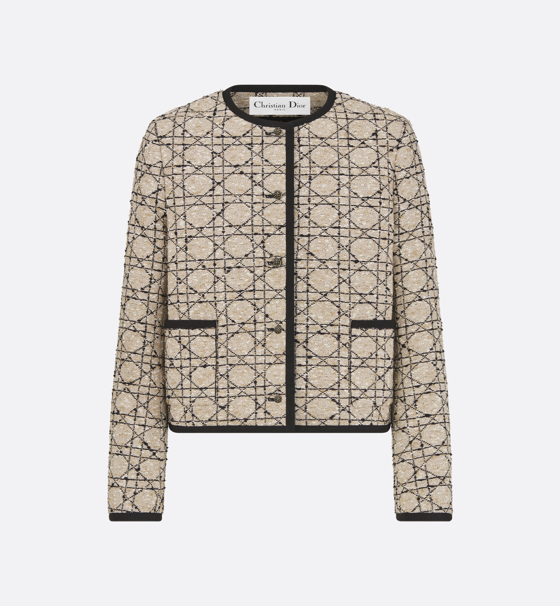 The cropped jacket offers a modern take on Dior's codes of elegance. Crafted in beige cotton-blend tweed with a black Macrocannage motif, it features a cropped, regular-fit silhouette adorned with Dior Tribales buttons, finely carved in silver-finish metal with the CD signature and inspired by the iconic House earring. Complete with patch pockets and tonal grosgrain, the jacket can be paired with other Macrocannage creations for a signature look. - Front Dior Tribales button closure - Grosgrain details - Lined sleeves - 56% cotton, 28% acrylic, 16% polyamide - Made in Italy - We recommend removing the accessories before cleaning Size & Fit - Cropped regular fit - Long sleeves - Using our personalized tool will provide you with the best size recommendation - For more information, please review the size guide