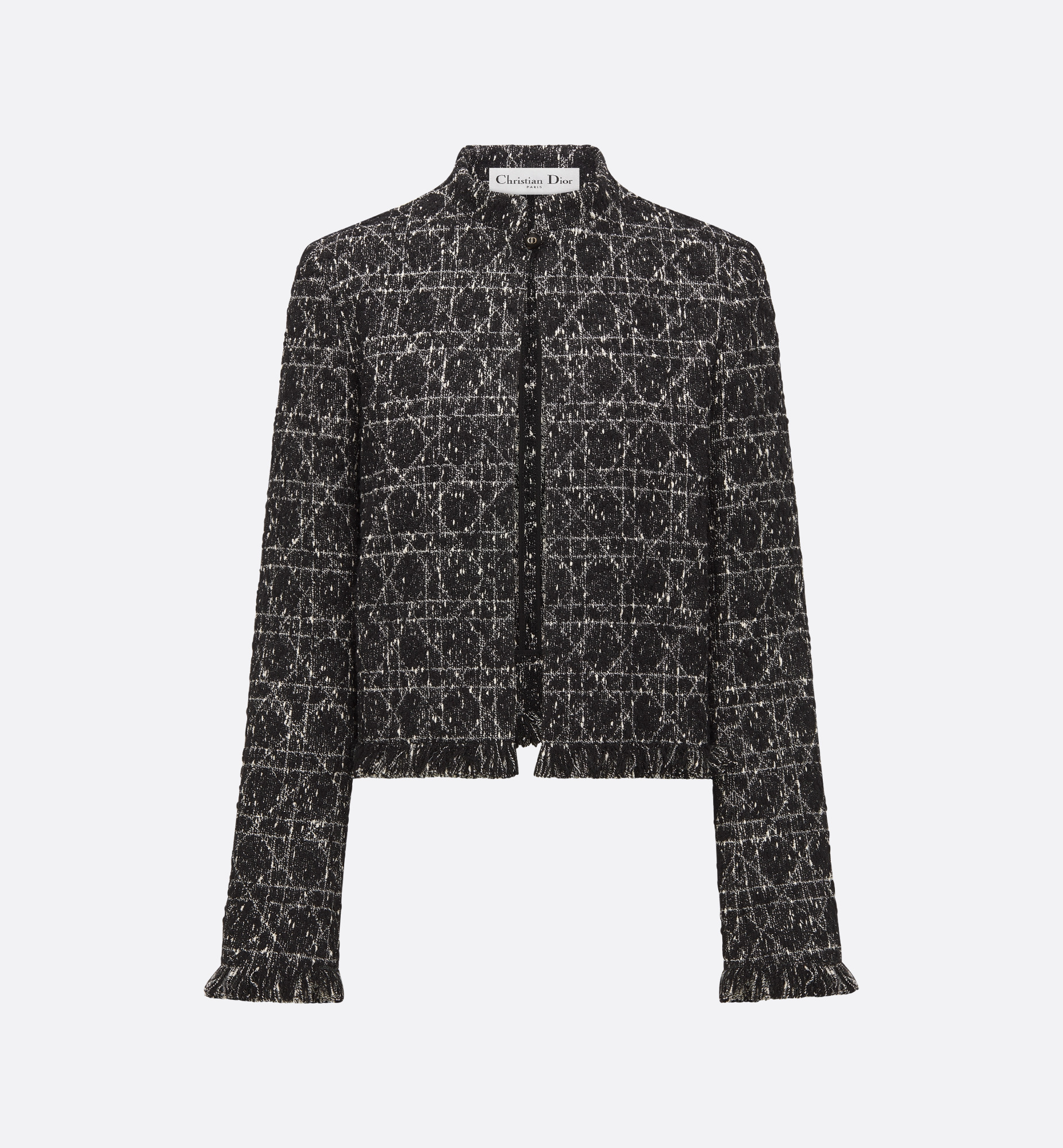 The jacket offers a modern take on Dior's codes of elegance. Crafted in black cotton-blend tweed with a white Macrocannage motif, it features a cropped, regular-fit silhouette adorned with Dior Tribales buttons, showcasing a CD resin pearl inspired by the iconic House earring. The jacket can be paired with a skirt from the season for a refined look. - Dior Tribales button closure at the neck - Tonal lining - 54% cotton, 27% acrylic, 19% polyamide - Made in Italy - We recommend removing the accessories before cleaning Size & Fit - Cropped regular fit - Long sleeves - Using our personalized tool will provide you with the best size recommendation - For more information, please review the size guide