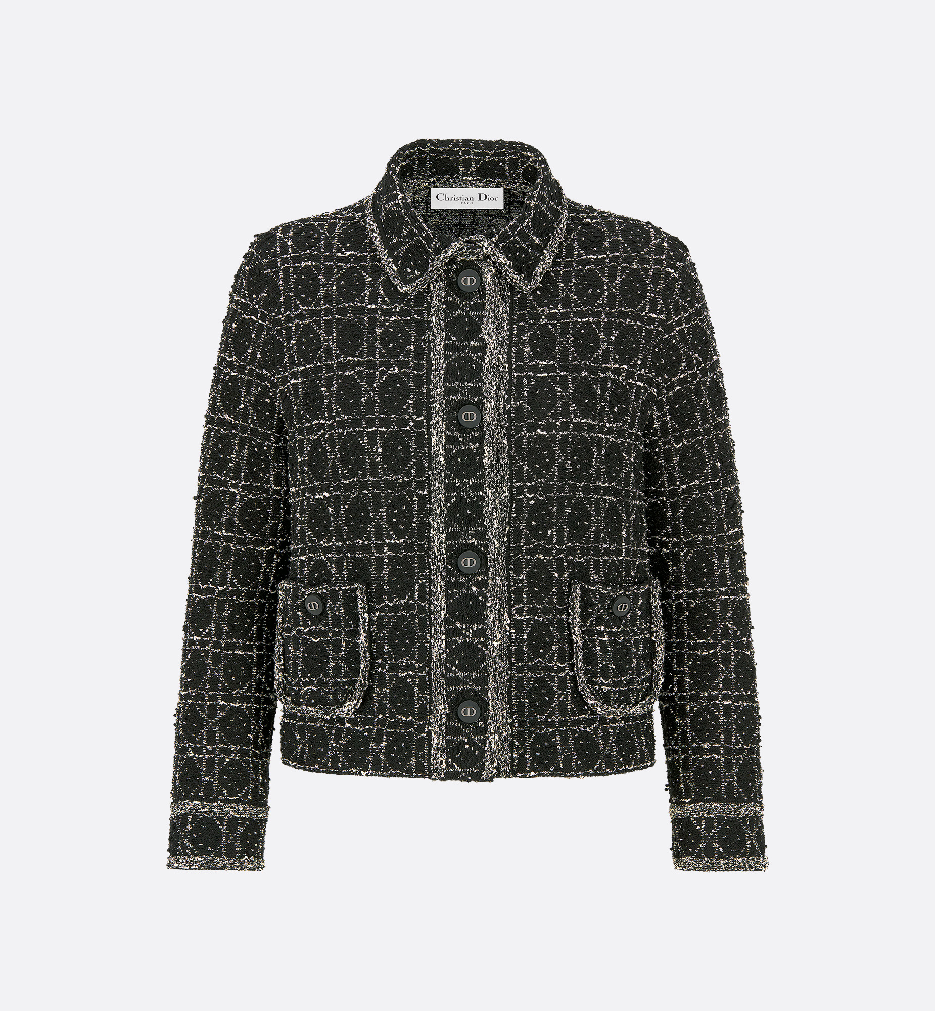 Combining modernity and elegance, the jacket features the signature Macrocannage motif. Crafted in black and white technical cotton tweed with a textured effect, it features a cropped, straight silhouette that is distinguished by black CD signature buttons and patch pockets at the waist. The jacket will pair well with the matching skirt to complete the look. - Front button closure - CD signature horn buttons - 64% cotton, 27% polyester, 7% acrylic, 2% polyamide - Made in Italy Size & Fit - Cropped straight cut - Front length from the shoulder: 50 cm / 19.5 inches (size 34) - Long sleeves - The model measures 177 cm / 69.5 inches and the item shown is in size 36 (FR) - Using our personalized tool will provide you with the best size recommendation - For more information, please review the size guide