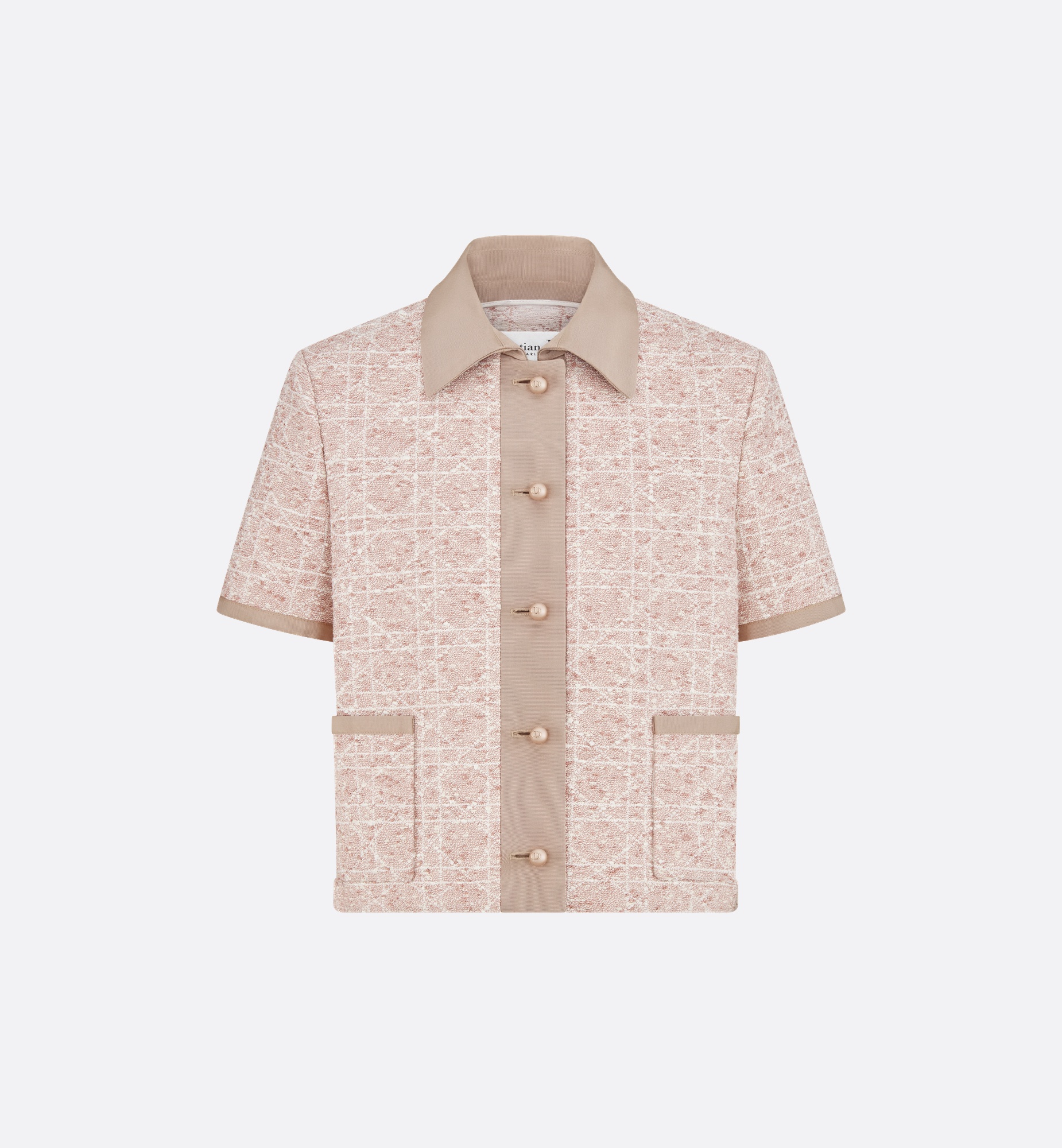 The short-sleeved jacket revisits House codes of modern elegance. Crafted in cotton-blend tweed with a pink Macrocannage motif, it has a relaxed, cropped silhouette. Featuring patch pockets and distinctive grosgrain detailing, it fastens with Dior Tribales buttons adorned with a CD resin pearl, inspired by the iconic House earring. The jacket can be paired with the matching skirt to complete the look. - Front Dior Tribales button closure - Grosgrain details - Lined sleeves - 56% cotton, 28% acrylic, 16% polyamide and lining: 100% silk - Made in Italy - We recommend removing the accessories before cleaning Size & Fit - Cropped regular fit - Short sleeves - Using our personalized tool will provide you with the best size recommendation - For more information, please review the size guide