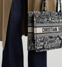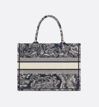 Introduced by Maria Grazia Chiuri, Creative Director of Christian Dior, the Dior Book Tote has become a staple of the Dior aesthetic. Designed to hold all the daily essentials, the style is fully embroidered with the blue and ecru Toile de Jouy Reverse motif, a variation of the House's hallmark pattern with a play on reversed colors. Adorned with the Christian Dior Paris signature on the front, the medium tote exemplifies the House's signature savoir-faire and may be carried by hand or worn over the shoulder. - Main composition: cotton - Cotton and calfskin lining - Christian Dior Paris signature on the front - Dust bag included - Made in Italy Size & Fit - Dimensions: 36 x 27.5 x 16.5 cm / 14 x 11 x 6.5 inches (Length x Height x Width) - The bag's large size can accommodate a 15-inch laptop, a pouch, a wallet, a phone, sunglasses and lipstick - Handle length: 42 cm / 16.5 inches - Handle drop length: 16 cm / 6.5 inches - Weight: 624 g / 22 ounces