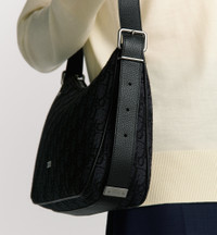 New for Winter 2025, the Dior Slider zipped hobo bag is refined and modern. Its streamlined, supple silhouette in black Dior Oblique jacquard is enhanced by topstitch detailing and decorative metal rivets on the front, as well as a tonal Dior signature. The spacious compartment features a zip pocket, and the leather strap can be adjusted using the metal Dior Slider hardware, which combines function with sleek design. The medium style can be worn over the shoulder or crossbody for a signature Dior look. - Main composition: cotton, technical fabric and calfskin - Technical fabric, cotton and calfskin lining - Main zip compartment - Interior zip pocket - Adjustable leather shoulder strap with Dior Slider hardware - Topstitching and decorative rivets on the front - Ruthenium-finish brass Dior signature on the front - Embossed Dior signature on the interior - Dust bag included - Made in Italy Size & Fit - Dimensions: 34 x 23 x 8.5 cm / 13.5 x 9 x 3.5 inches (Length x Height x Width) - Size and weight details may vary depending on the product's material