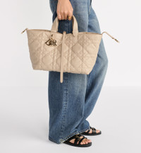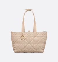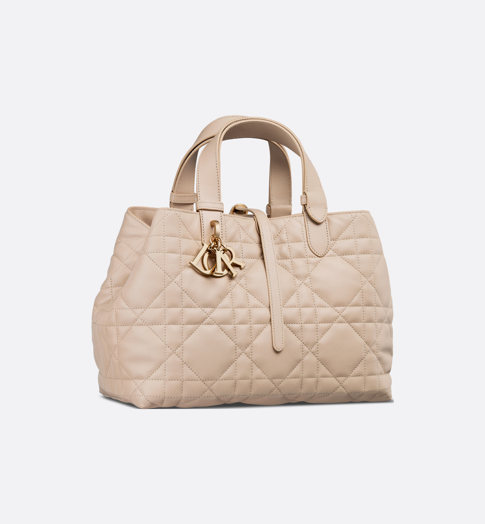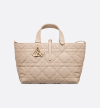 The Dior Toujours bag is distinguished by a casual and practical design. Crafted in powder beige calfskin with Macrocannage topstitching, it showcases a spacious interior compartment with a matching pouch to organize the essentials. Its thin leather strap closure keeps items secure while the D of the CD Lock clasp twists to alter the sides and enhance the bag's silhouette. The leather top handles can be adjusted using the small notches so the medium bag can be carried by hand or worn over the shoulder. - Main composition: calfskin - Calfskin lining - Double closure: a thin lace-through strap and a Christian Dior Paris strap with a CD Lock clasp - D.I.O.R. charms - Removable interior pouch - Adjustable leather top handles - Dust bag included - Made in Italy Size & Fit - Dimensions: 28.5 x 21.5 x 17 cm / 11 x 8.5 x 6.5 inches (Length x Height x Width) - The size is suitable for two wallets, a phone, two card holders, sunglasses and lipstick - Top handle length: 29 – 54 cm / 11.5 – 21.5 inches - Top handle drop length: 10.5 – 23 cm / 4 – 9 inches - Weight: 850 g / 30 ounces - Size and weight details may vary depending on the product's material