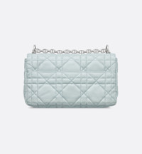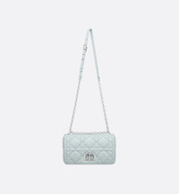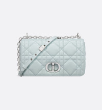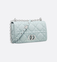 The Soft Dior Caro bag showcases a supple construction combining modernity and timeless elegance. The luxurious placid blue lambskin style is embellished with Macrocannage topstitching, while the flap is adorned with an antique silver-finish metal CD twist clasp, inspired by the seal of a Christian Dior perfume bottle. The detachable chain strap with CD links allows the medium bag to be carried by hand, worn over the shoulder or crossbody, and may be replaced by one of the House's wide embroidered straps for day or evening attire. - Main composition: lambskin - Lambskin lining - Flap closure with CD twist clasp - Adjustable, detachable CD chain link strap with Christian Dior Paris military-inspired buckle - Two removable links with an X-shaped center notch allow the chain to be opened - Interior zip pocket and slip pocket - Rear slip pocket - The bag may be paired with the House's different embroidered straps - Dust bag included - Made in Italy Size & Fit - Dimensions: 25 x 16 x 9 cm / 10 x 6.5 x 3.5 inches (Length x Height x Width) - The size is suitable for a phone, a wallet and lipstick - Chain length: 117 – 127 cm / 46 – 50 inches - Chain drop length: 47 – 52 cm / 18.5 – 20.5 inches - Weight: 650 g / 23 ounces - Size and weight details may vary depending on the product's material