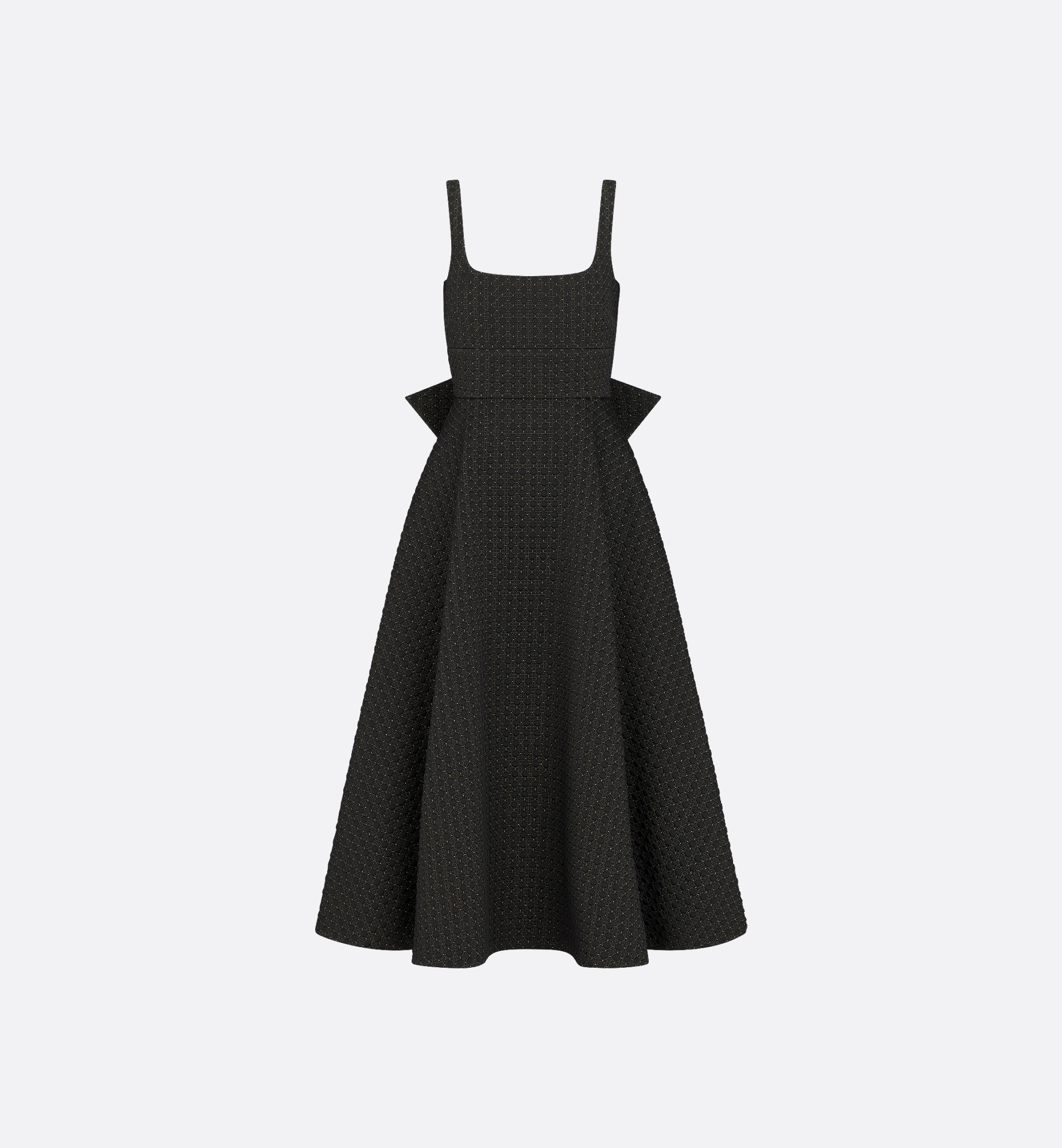 The mid-length dress, a hallmark Dior silhouette, is a sophisticated and modern design. Crafted in black technical fabric with a quilted Microcannage motif, it features an elegant flared cut enhanced by a square neckline and a wide waistband adorned with a large bow in the back. The mid-length dress will create a couture look. - Wide waistband with bow in the back - Rear zip closure - Half lined - 77% polyester, 14% polyamide, 9% partially oriented polyester and lining: 100% silk - Made in France Size & Fit - Flared cut - Mid-length - Sleeveless - Using our personalized tool will provide you with the best size recommendation - For more information, please review the size guide