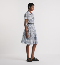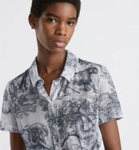 The shirtdress showcases the House's hallmark Toile de Jouy motif in navy blue. Created in cotton muslin, it features a long and fluid silhouette enhanced by a spread collar and pleated details that highlight the waist, as well as practical side pockets. The airy shirtdress can be paired with other Toile de Jouy creations for a complete look. - Front button closure - Christian Dior Paris signature mother-of-pearl buttons - Pleated style - Removable tonal lining - 100% cotton - Made in Italy Size & Fit - Flared cut - Mid-length silhouette - Length: 100 cm / 39.5 inches (size 36) - Short sleeves - Using our personalized tool will provide you with the best size recommendation - For more information, please review the size guide