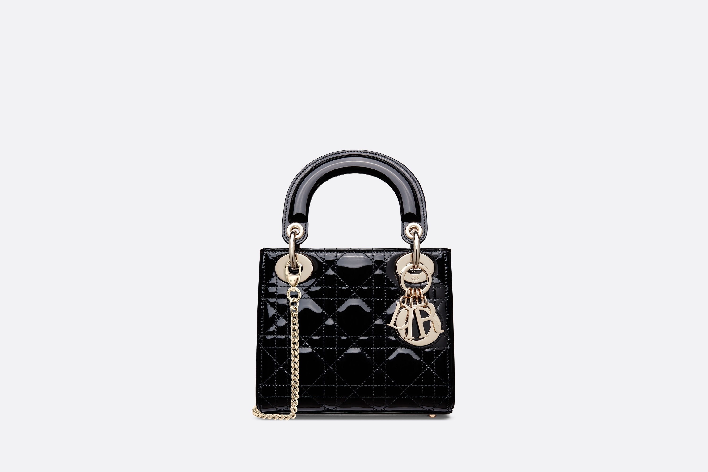 The Lady Dior bag epitomizes the House's vision of elegance and beauty. Sleek and refined, the timeless style is crafted in black patent calfskin with Cannage stitching, creating the legendary and instantly recognizable quilted texture, while pale gold-finish metal D.I.O.R. charms further embellish its silhouette. Featuring a removable chain strap, the miniature Lady Dior bag can be carried by hand or crossbody as an ideal evening wear companion. - Main composition: calfskin - Goatskin and calfskin lining - Detachable chain - Interior zip pocket - The bag may be paired with the House's different embroidered straps - Dust bag included - Made in Italy/France Size & Fit - Dimensions: 17 x 15 x 7 cm / 6.5 x 6 x 3 inches (Length x Height x Width) - The size is suitable for a phone, a card holder and lipstick - Chain length: 116 cm / 45.5 inches - Chain drop length: 57 cm / 22.5 inches - Weight: 725 g / 25.5 ounces