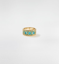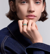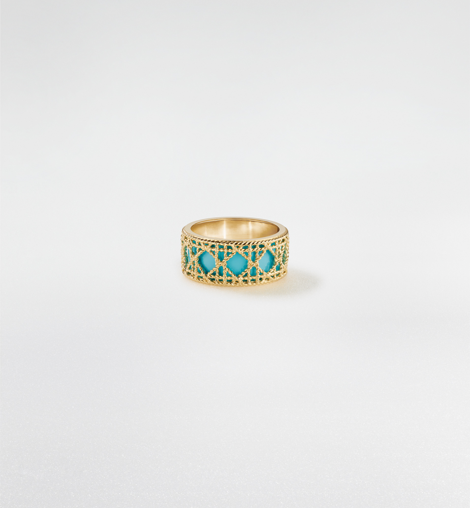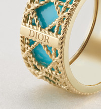 The My Dior collection by Victoire de Castellane is reinvented with a series of infinitely precious jewelry pieces. In an ode to the art of detail, a tangle of golden threads is woven together like meticulously interlaced sprigs of straw into a subtle mesh, revealing the iconic Cannage, accented by a strip of shiny gold. The craftsmanship is an homage to Dior's refined style. A signature technique by Victoire de Castellane, lacquer is combined with gold to create unique pieces with a harmonious interplay of contrasts. These vibrant designs, embellished with the hallmark raised Cannage motif, reflect the daring creativity of Dior Joaillerie's Creative Director. - 18K yellow gold - Turquoise lacquer Size & Fit - You may refer to the size guide on the website - For more information on sizing, we invite you to visit a boutique - We recommend styling My Dior rings together to create a unique look. The ring also pairs well with other creations from the My Dior collection