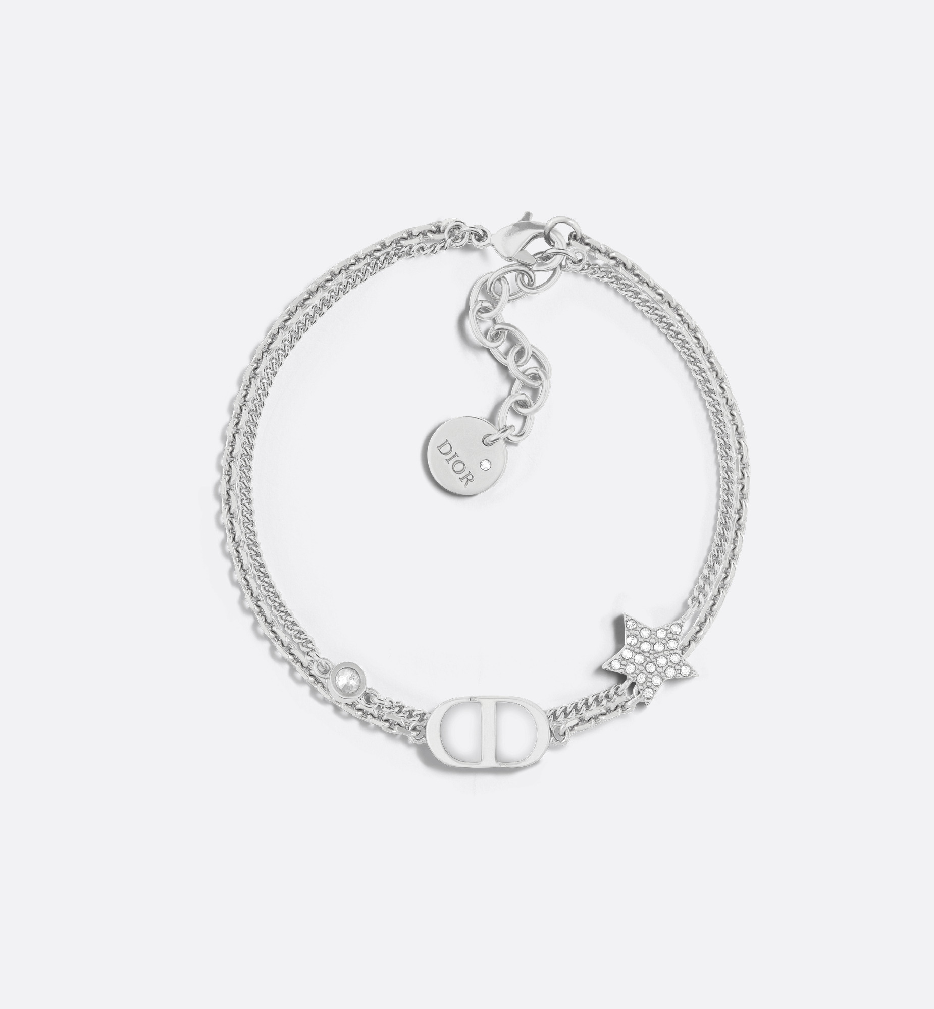 The Petit CD bracelet is a modern and elegant piece. Finely crafted in palladium-finish metal, the double-layered design features the CD signature and a star encrusted with silver-tone sparkling crystals. Elegant and timeless, the bracelet may be worn with other creations from the Petit CD line. - Silver-tone crystals - CD signature - Star detailing - Palladium-finish metal - Lobster clasp - Made in Europe Size & Fit - Adjustable length: 15 – 18 cm / 6 – 7 inches - CD dimensions: 1.2 x 0.7 cm / 0.5 x 0.25 inch (Length x Height)