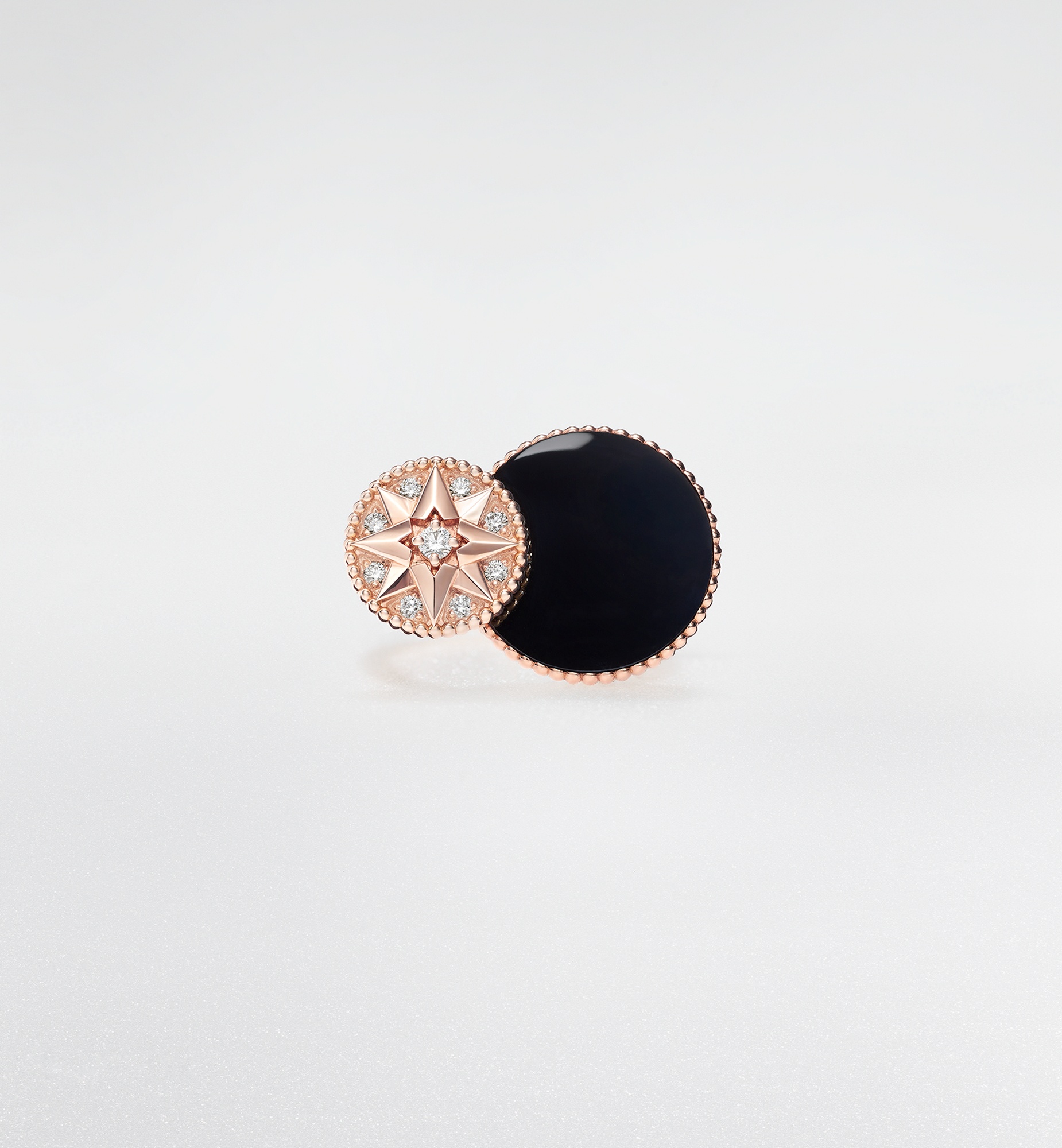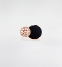 The Rose des Vents creations, inspired by the Villa Les Rhumbs garden mosaic in Granville, showcase sparkling ornamental stones and precious diamonds, embodying the essence of Dior fine jewelry. The collection's Tribale aesthetic is offered in a majestic ring, layering the diamond-set Rose des Vents motif and onyx encircled by gold beading. The bold design is ideal for a contemporary look and a perfect complement to other Rose des Vents creations. - 18K pink gold - Diamonds (0.16 ct*) - Onyx - Motif diameters: 12 and 17 mm / 0.5 and 0.7 inch Size & Fit - You may refer to the size guide on the website - For more information on sizing, we invite you to visit a boutique - To create a unique look, Rose des Vents rings can be paired with each other