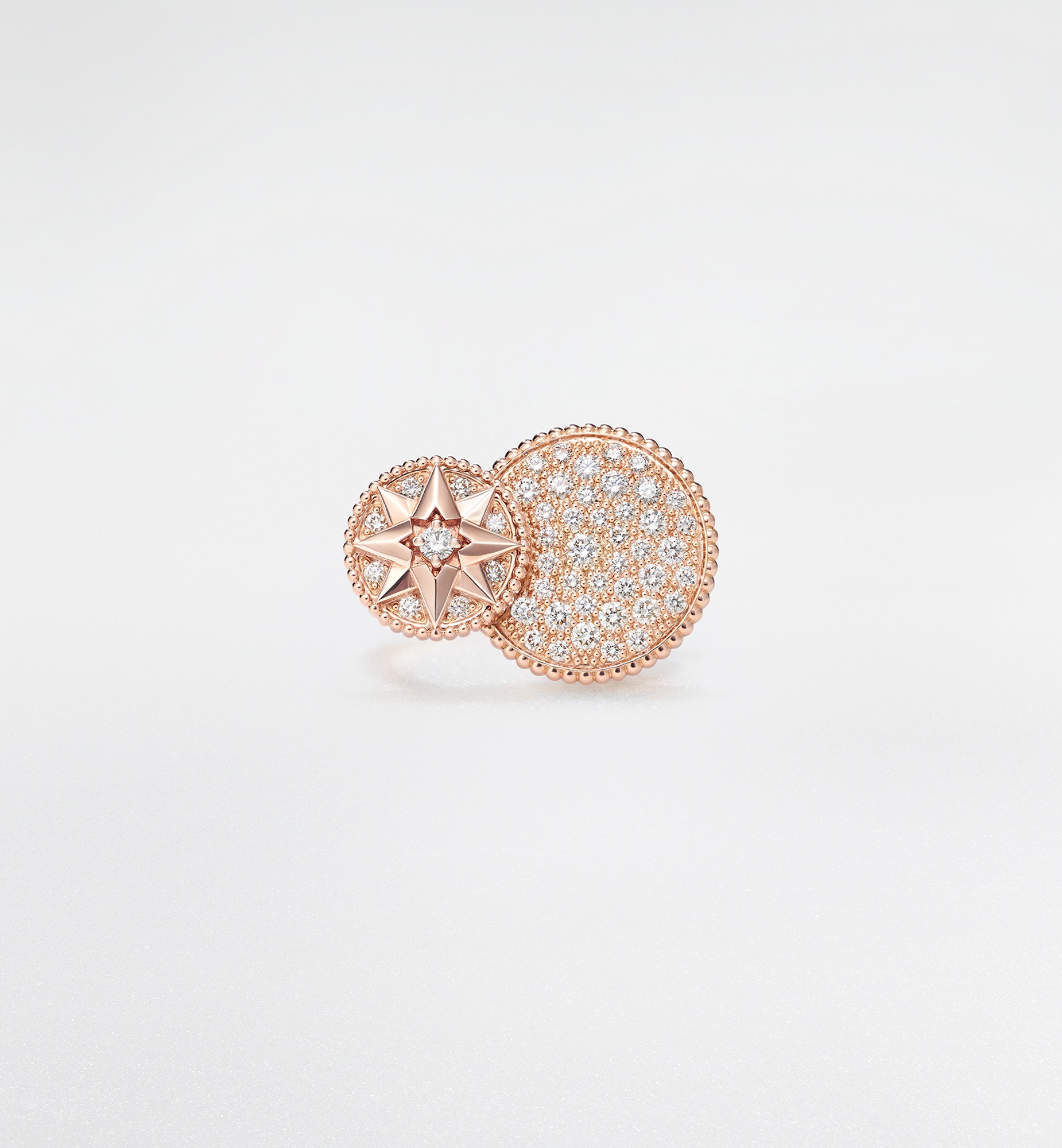 The Rose des Vents creations, inspired by the Villa Les Rhumbs garden mosaic in Granville, showcase colorful ornamental stones and precious diamonds, embodying the essence of Dior fine jewelry. The exquisite ring blends the iconic Rose des Vents design with the radiance of pink gold, enhancing the brilliance and purity of the diamonds. The artisanal snow setting technique accentuates their sparkle, capturing the shimmer of sunlit snow. Timeless and elegant, the piece can be effortlessly paired with other treasures from the Rose des Vents collection. - 18K pink gold - Diamonds (0.97 ct*) - Motif diameters: 12 and 17 mm / 0.5 and 0.7 inch Size & Fit - You may refer to the size guide on the website - For more information on sizing, we invite you to visit a boutique - To create a unique look, Rose des Vents rings can be paired with each other