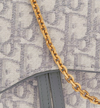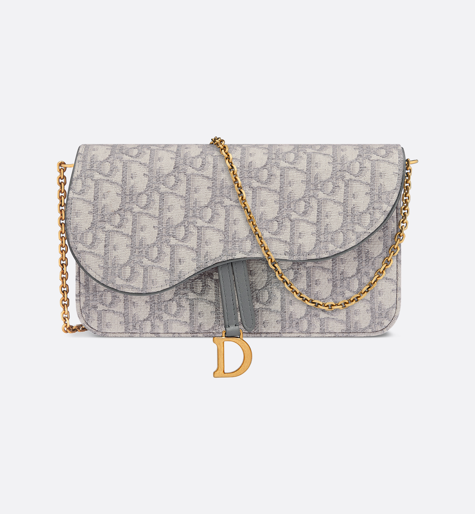 The Saddle pouch with chain is a modern and practical creation with smooth and harmonious lines. Crafted in gray Dior Oblique jacquard, it features an asymmetric flap and an antique gold-finish metal D stirrup. The spacious interior will accommodate any essentials, while the chain allows it to be worn over the shoulder or crossbody. The medium pouch can be ideally paired with other Saddle creations. - Main composition: cotton and lambskin - Cotton, linen, calfskin and technical fabric lining - Flap closure - Front D stirrup - One compartment - Six card slots - One slip pocket - One zip pocket - Made in Italy Size & Fit - Dimensions: 21.5 x 12.5 x 4.5 cm / 8.5 x 5 x 2 inches (Length x Height x Width) - The size is suitable for a phone, a card holder and lipstick - Chain length: 118 cm / 46.5 inches - Chain drop length: 57 cm / 22.5 inches - Weight: 280 g / 10 ounces