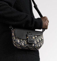 The Saddle messenger bag with flap enhances the iconic line with a modern design imbued with subtle elegance. Crafted in beige and black Dior Oblique jacquard, it features a black grained calfskin Saddle flap with an aluminum Christian Dior signature buckle. The removable and adjustable leather shoulder strap allows the miniature bag to be carried by hand, worn over the shoulder or crossbody. - Nylon interior - Interior slip pocket - Rear magnetic slip pocket - Removable and adjustable leather shoulder strap - Ruthenium-finish brass Dior signature on front - Embossed Dior signature on interior - Dust bag included - Made in Italy/Spain Size & Fit - Dimensions: 19.5 x 13 x 4.3 cm / 7.5 x 5 x 1.5 inches (Length x Height x Width) - The size is suitable for two phones - Strap length: 97 - 122 cm / 38 - 48 inches - Drop length: 46 - 58 cm / 18 - 23 inches - Weight: 375 g / 13 ounces