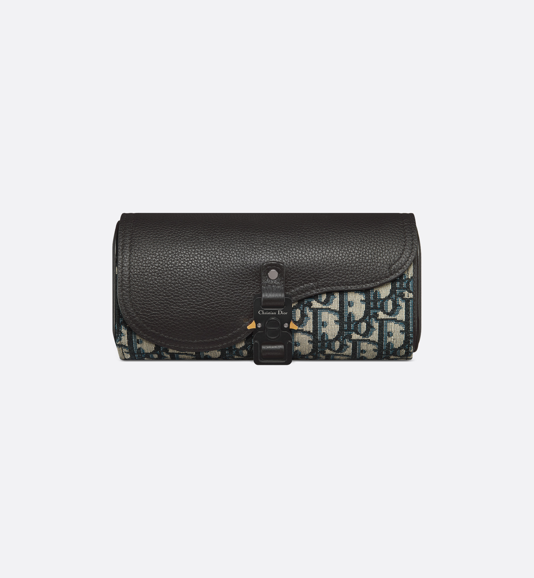 The Saddle watch roll is a practical and elegant accessory. Crafted in beige and black Dior Oblique jacquard, it is characterized by its oval shape showcasing a black grained calfskin Saddle flap enhanced by an aluminum Christian Dior signature buckle. Featuring two cushions to house watches, the case is an essential travel companion. - Main composition: cotton, calfskin and technical fabric - Technical fabric and calfskin lining - Two removable cushions for watches - Saddle flap closure with aluminum Christian Dior signature buckle and CD initials - Embossed Dior signature on the interior - Dust bag included - Made in Italy/Spain Size & Fit - Dimensions: 18 x 10 x 7 cm / 7 x 4 x 3 inches (Length x Height x Width) - The size is suitable for two watches - Weight: 350 g / 12.5 ounces - Size and weight details may vary depending on the product's material