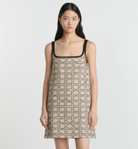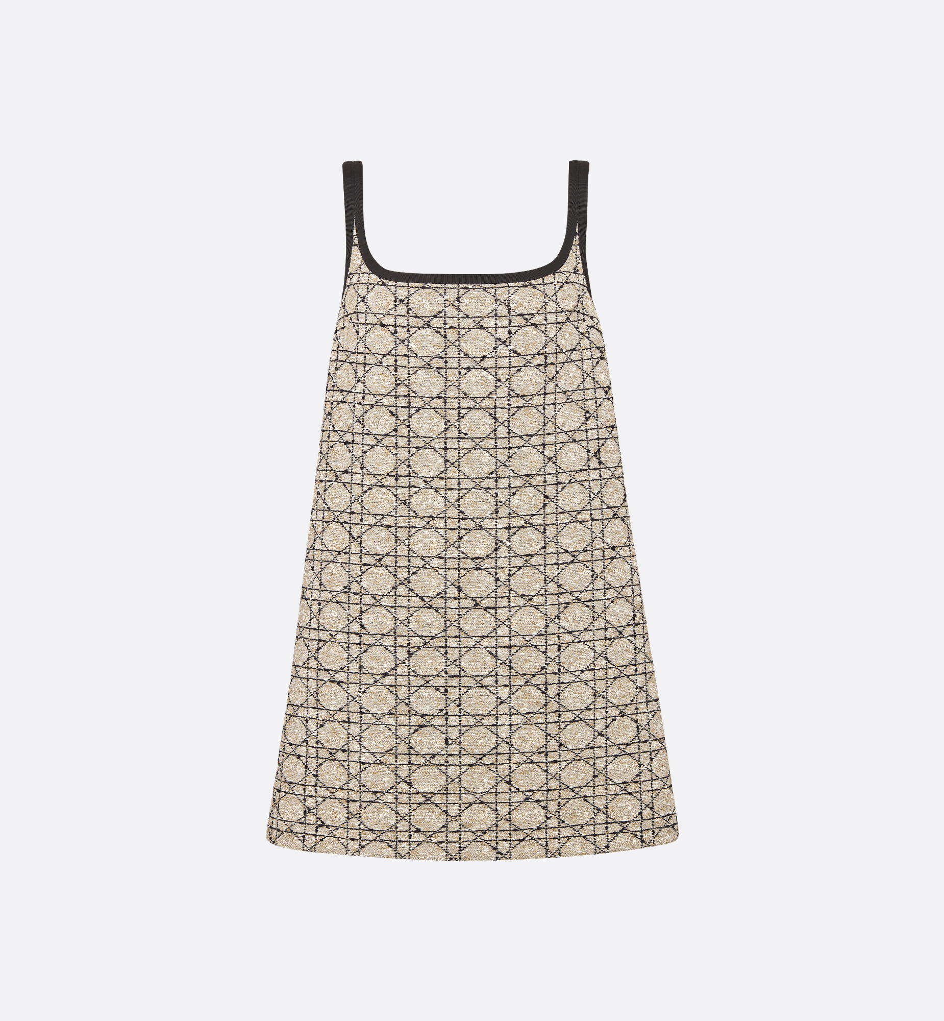 The short dress offers a modern take on Dior's codes of elegance. Crafted in beige cotton-blend tweed with a black Cannage motif, it features a very elegant A-line silhouette. The dress can be paired with boots from the season for a contemporary look. - Side zip and hook closure - Tonal lining - 42% cotton, 42% acrylic, 16% polyamide and lining: 100% silk - Made in Italy Size & Fit - Flared cut - Short silhouette - Sleeveless - Using our personalized tool will provide you with the best size recommendation - The model measures 177 cm / 69.5 inches and the item shown is in size 36 (FR) - For more information, please review the size guide