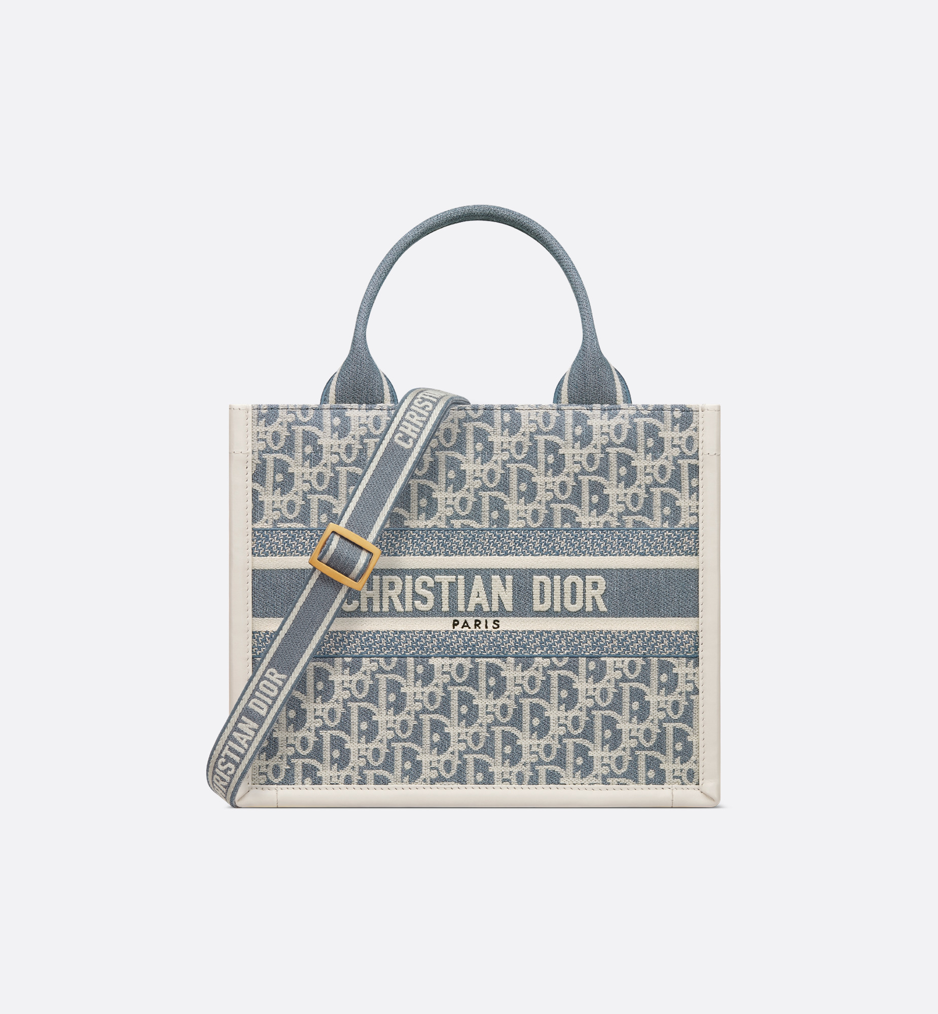 Maria Grazia Chiuri's hallmark Dior Book Tote is offered in an elegant variation. The refined style combines latte calfskin and Dior Oblique Chambray embroidery, a lightweight blue cotton denim embroidered with raffia and cotton thread forming the iconic Dior Oblique motif. Designed to keep all the daily essentials organized, the interior is equipped with a zip pocket and slip pockets. Featuring an adjustable and removable embroidered strap, the practical small tote exemplifies Dior's savoir-faire and can be carried by hand or worn over the shoulder. - Main composition: cotton and calfskin - Christian Dior Paris signature on the front - Embroidered adjustable and removable shoulder strap - Interior zip pocket - Two interior slip pockets - Dust bag included - Made in Italy Size & Fit - Dimensions: 26.5 x 22 x 14 cm / 10.5 x 8.5 x 5.5 inches (Length x Height x Width) - The size is suitable for a phone, a wallet, a card holder and sunglasses - Strap length: 72 – 132 cm / 28.5 – 52 inches - Drop length: 34 – 64 cm / 13.5 – 25 inches - Top handle length: 31 cm / 12 inches - Top handle drop length: 11 cm / 4.5 inches - Weight: 735 g / 26 ounces - Size and weight details may vary depending on the product's material