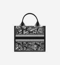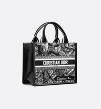 Maria Grazia Chiuri's hallmark Dior Book Tote is presented in an elegant new variation. The refined style showcases the black and white Plan de Paris embroidery and black calfskin. The motif is inspired by House archives and structured around Dior's historic Avenue Montaigne address. Designed to keep all the daily essentials organized, the interior is equipped with a zip pocket and slip pockets. Featuring an adjustable and removable shoulder strap, the practical small tote exemplifies Dior's savoir-faire and can be carried by hand or worn over the shoulder. - Main composition: cotton and calfskin - Cotton and calfskin lining - Adjustable and removable cotton shoulder strap - Interior zip pocket - Two interior slip pockets - Dust bag included - Made in Italy Size & Fit - Dimensions: 26.5 x 22 x 14 cm / 10.5 x 8.5 x 5.5 inches (Length x Height x Width) - Strap length: 72 – 132 cm / 28.5 – 52 inches - Drop length: 34 – 64 cm / 13.5 – 25 inches - Handle length: 31 cm / 12 inches - Top handle drop length: 11.5 cm / 4.5 inches - Weight: 735 g / 26 ounces