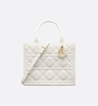Maria Grazia Chiuri's hallmark Dior Book Tote is offered in an elegant variation. Crafted in latte calfskin, the design showcases the Macrocannage motif and is embellished with pale gold-finish metal D.I.O.R. charms on one of the top handles. The cashmere leather interior reveals a zip pocket and slip pockets, ideal for organizing all the daily essentials. Featuring an adjustable and removable strap, the lightweight and practical small tote is a prime example of Dior savoir-faire and may be carried by hand or worn over the shoulder. - Adjustable and removable leather shoulder strap - Interior zip pocket - Two interior slip pockets - Dust bag included - Made in Italy Size & Fit - Dimensions: 26.5 x 22 x 14 cm / 10.5 x 8.5 x 5.5 inches (Length x Height x Width) - Strap length: 103 – 117 cm / 40.5 – 46 inches - Drop length: 49.5 – 57.5 cm / 19.5 – 22.5 inches - Top handle length: 32 cm / 12.5 inches - Top handle drop length: 12 cm / 4.5 inches - Weight: 735 g / 26 ounces