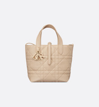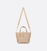 The Dior Toujours vertical tote bag is distinguished by a modern and practical design. Crafted in powder beige calfskin with Macrocannage topstitching, it has a spacious interior compartment to accommodate all the essentials. Its thin leather strap closure keeps items secure, while the D of the CD Lock clasp twists to adjust the sides and enhance the bag's silhouette. The leather top handles are completed by a removable leather strap, allowing the small bag to be carried by hand, worn over the shoulder or crossbody. - Main composition: calfskin - Calfskin lining - Double closure: a thin lace-through strap and a Christian Dior Paris strap with a CD Lock clasp - D.I.O.R. charms - Interior slip pocket for cards - Leather top handles - Removable leather shoulder strap - Dust bag included - Made in Italy Size & Fit - Dimensions: 16 x 18 x 12 cm / 6.5 x 7 x 4.5 inches (Length x Height x Width) - The size is suitable for two wallets, a phone, two card holders, sunglasses and lipstick - Size and weight details may vary depending on the product's material